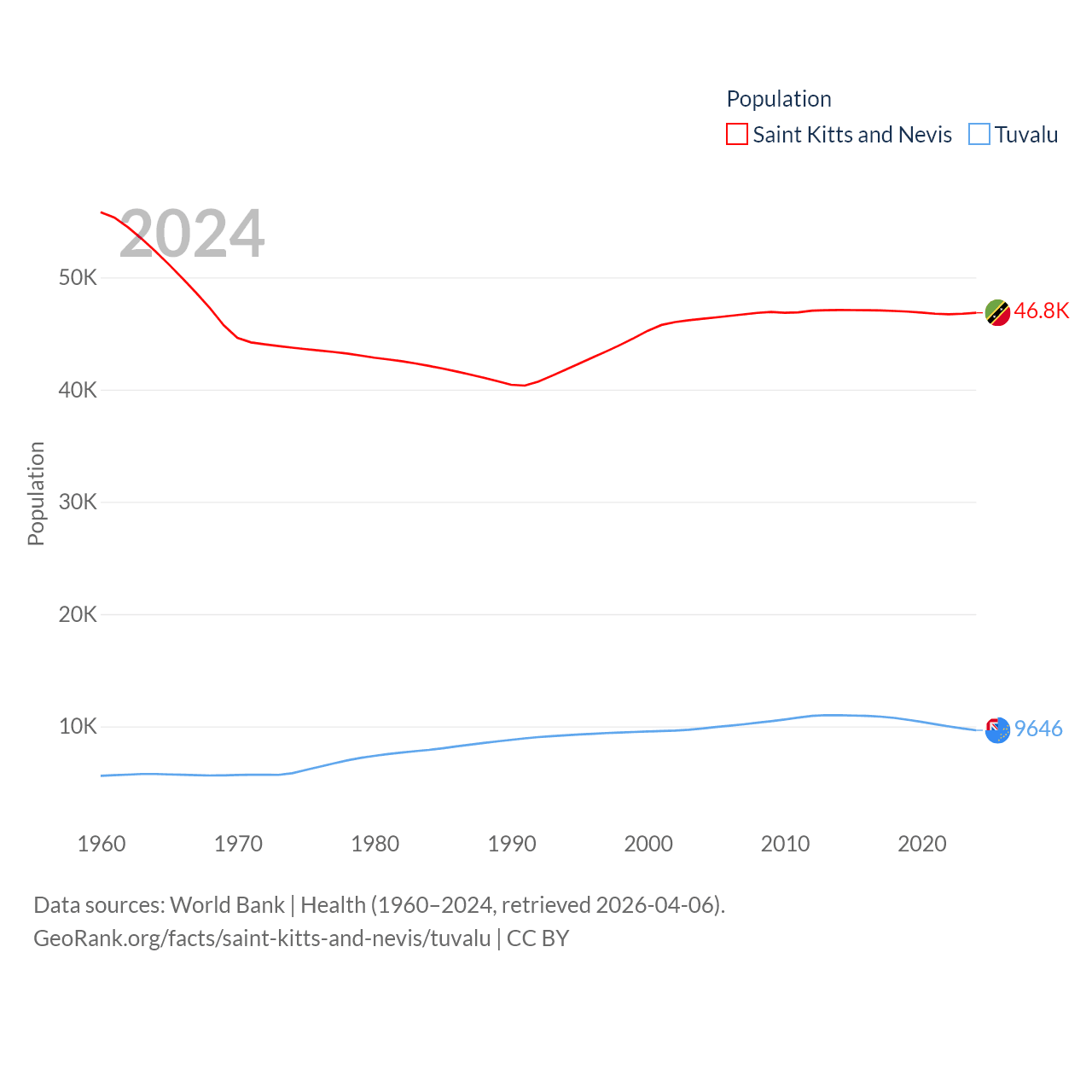 Saint Kitts and Nevis has a population of 46.8K (ranked 189/197), compared with 9.65K in Tuvalu (ranked 196/197). Saint Kitts and Nevis' land area is 100.4 sq mi versus 11.6 sq mi for Tuvalu (ranked 189th vs. 194th).