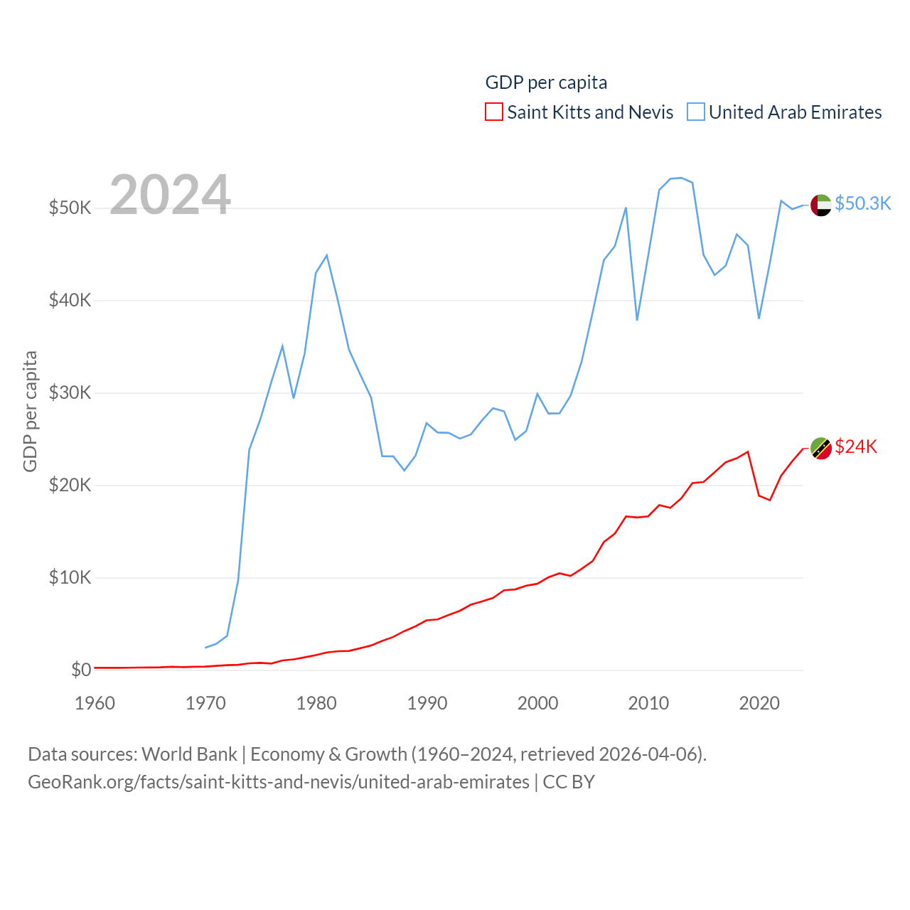 By GDP, Saint Kitts and Nevis ranks 187/197 ($1.12B) and The United Arab Emirates ranks 27/197 ($552B). By GDP per capita, Saint Kitts and Nevis ranks 51/197 ($23,961), while The United Arab Emirates ranks 24/197 ($50,274).