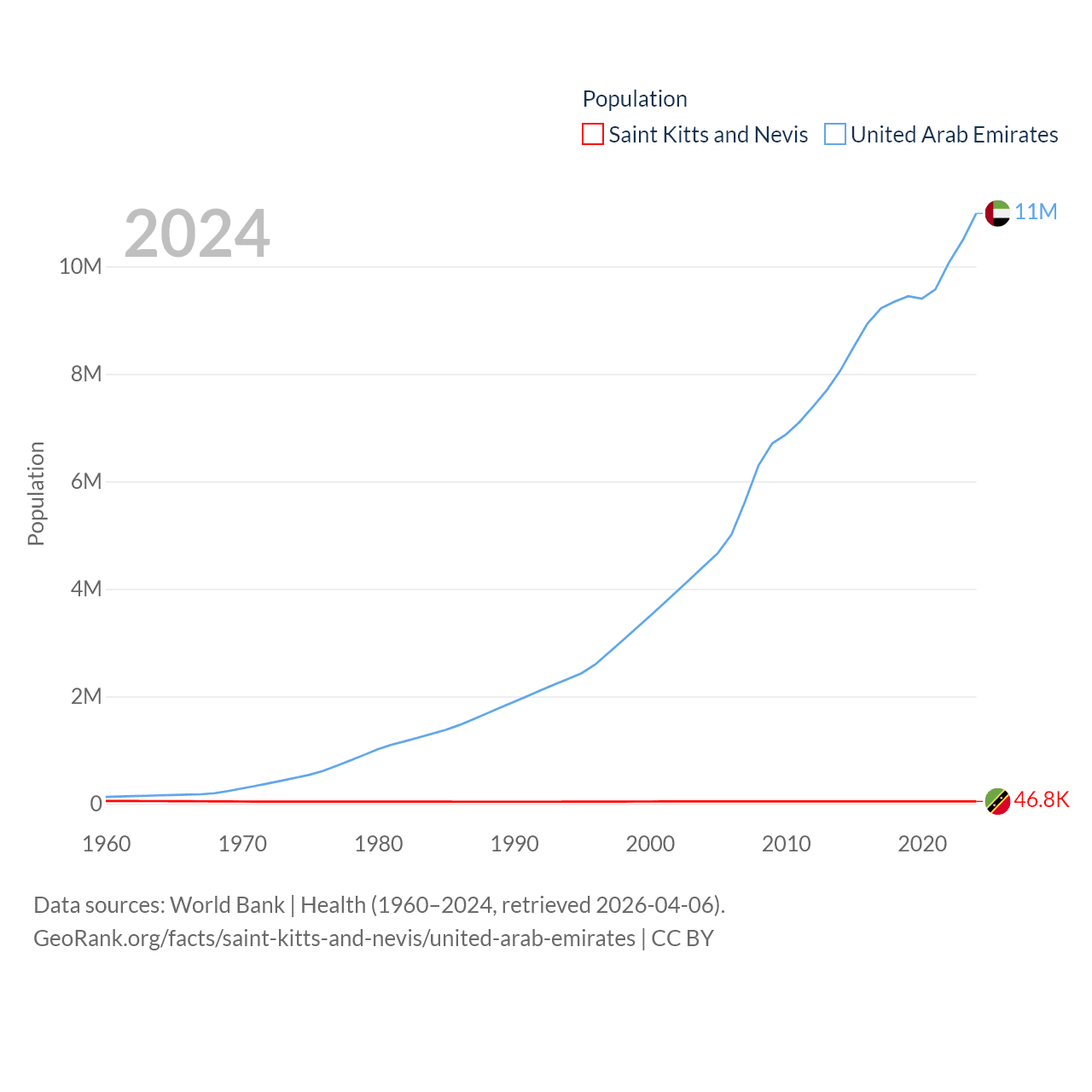 Saint Kitts and Nevis has a population of 46.8K (ranked 189/197), compared with 11M in The United Arab Emirates (ranked 86/197). Saint Kitts and Nevis' land area is 100.4 sq mi versus 27,421 sq mi for The United Arab Emirates (ranked 189th vs. 117th).