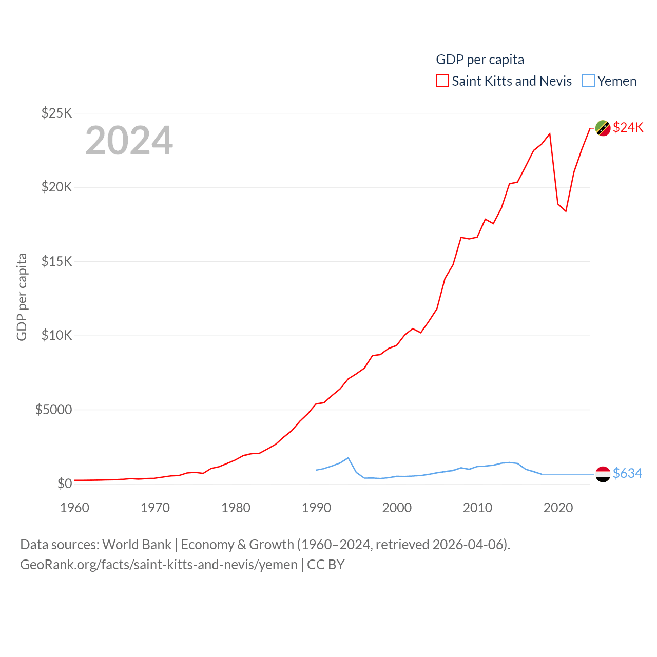 By GDP, Saint Kitts and Nevis ranks 187/197 ($1.12B) and Yemen ranks 125/197 ($21.6B). By GDP per capita, Saint Kitts and Nevis ranks 51/197 ($23,961), while Yemen ranks 191/197 ($634).