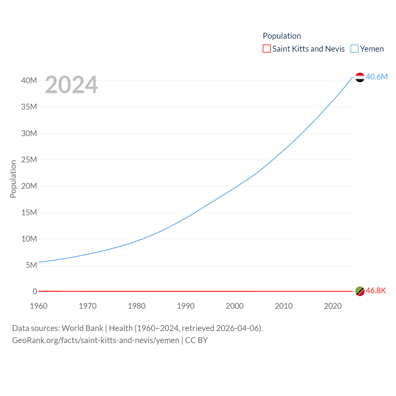 Saint Kitts and Nevis has a population of 46.8K (ranked 189/197), compared with 40.6M in Yemen (ranked 38/197). Saint Kitts and Nevis' land area is 100.4 sq mi versus 203,850 sq mi for Yemen (ranked 189th vs. 49th).