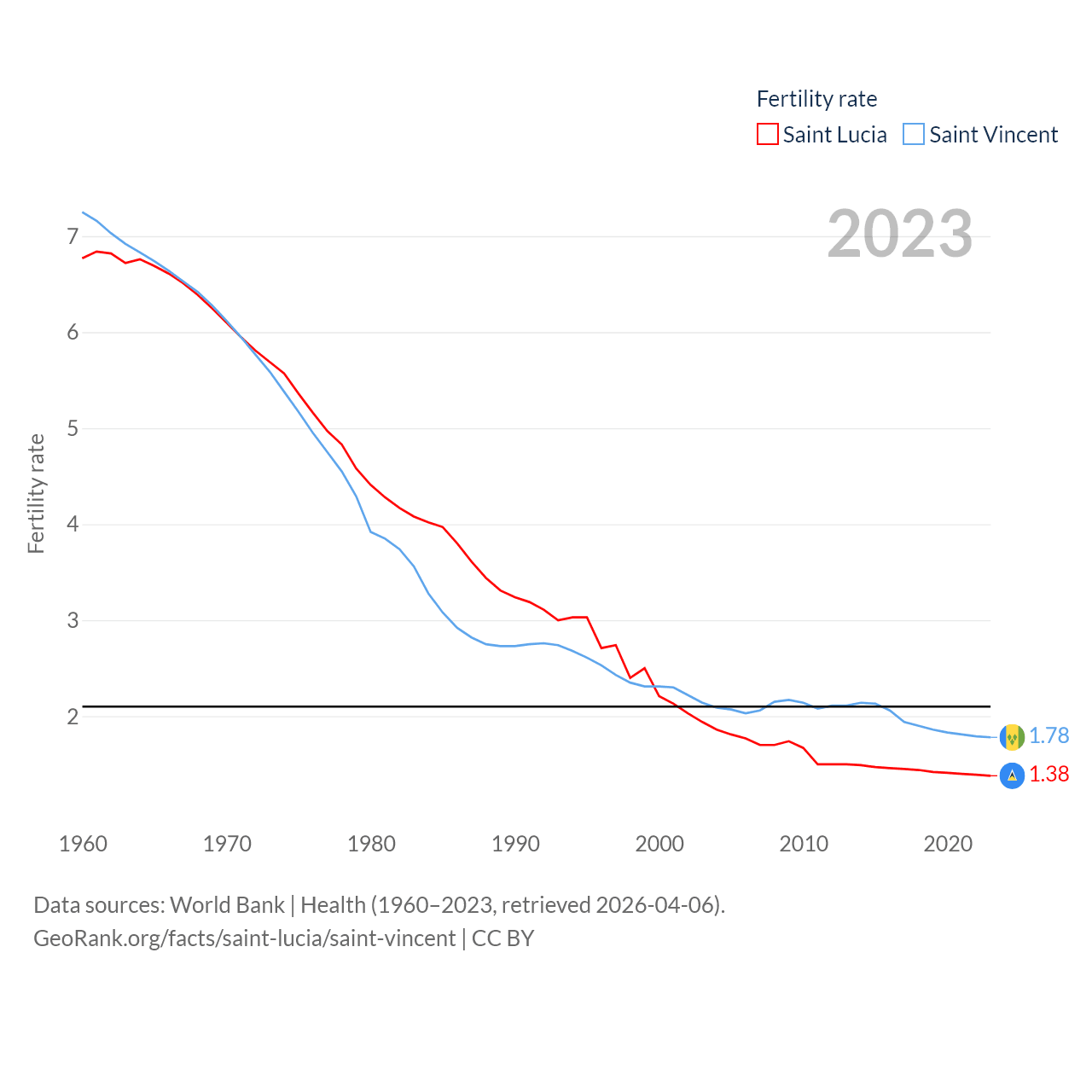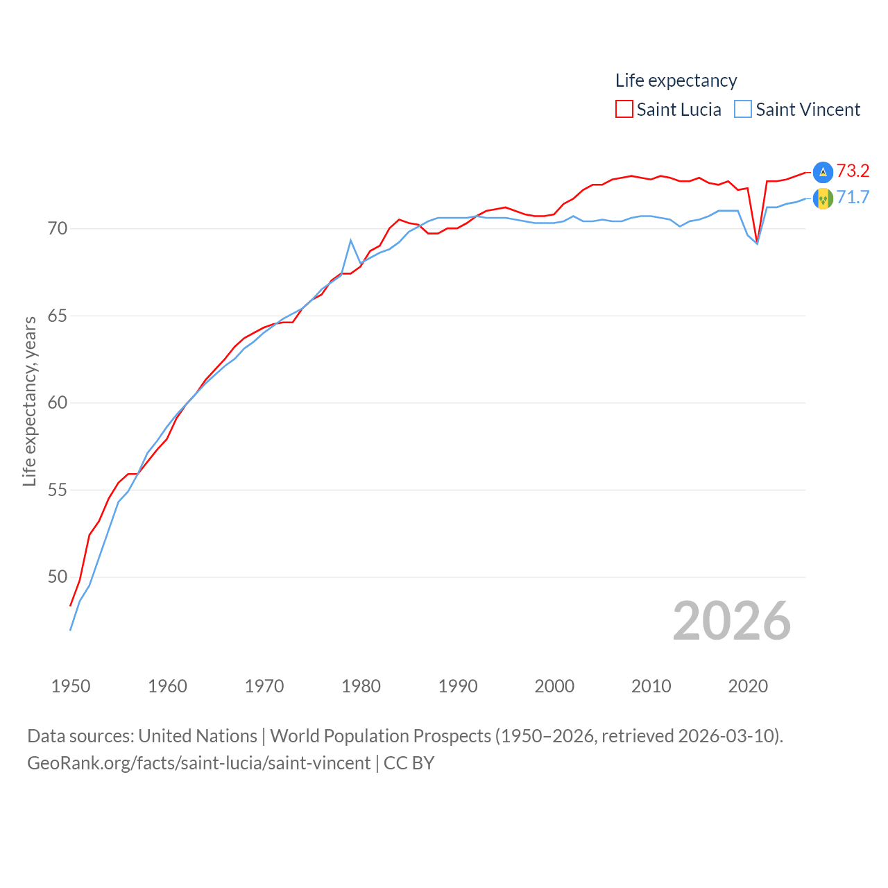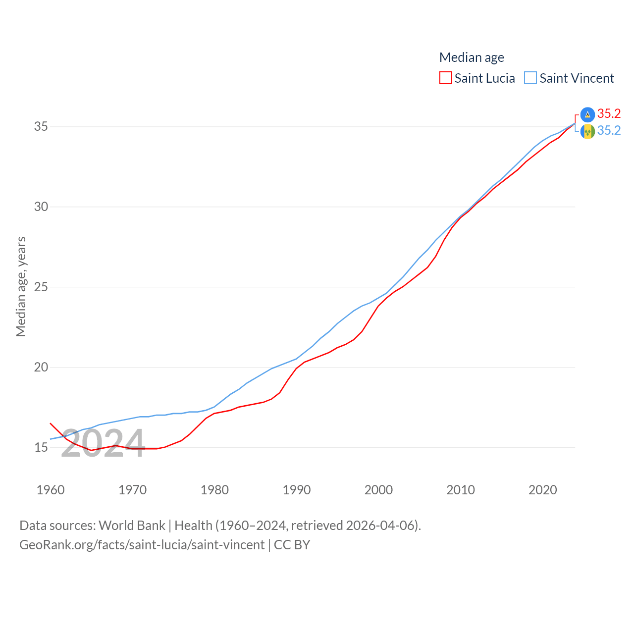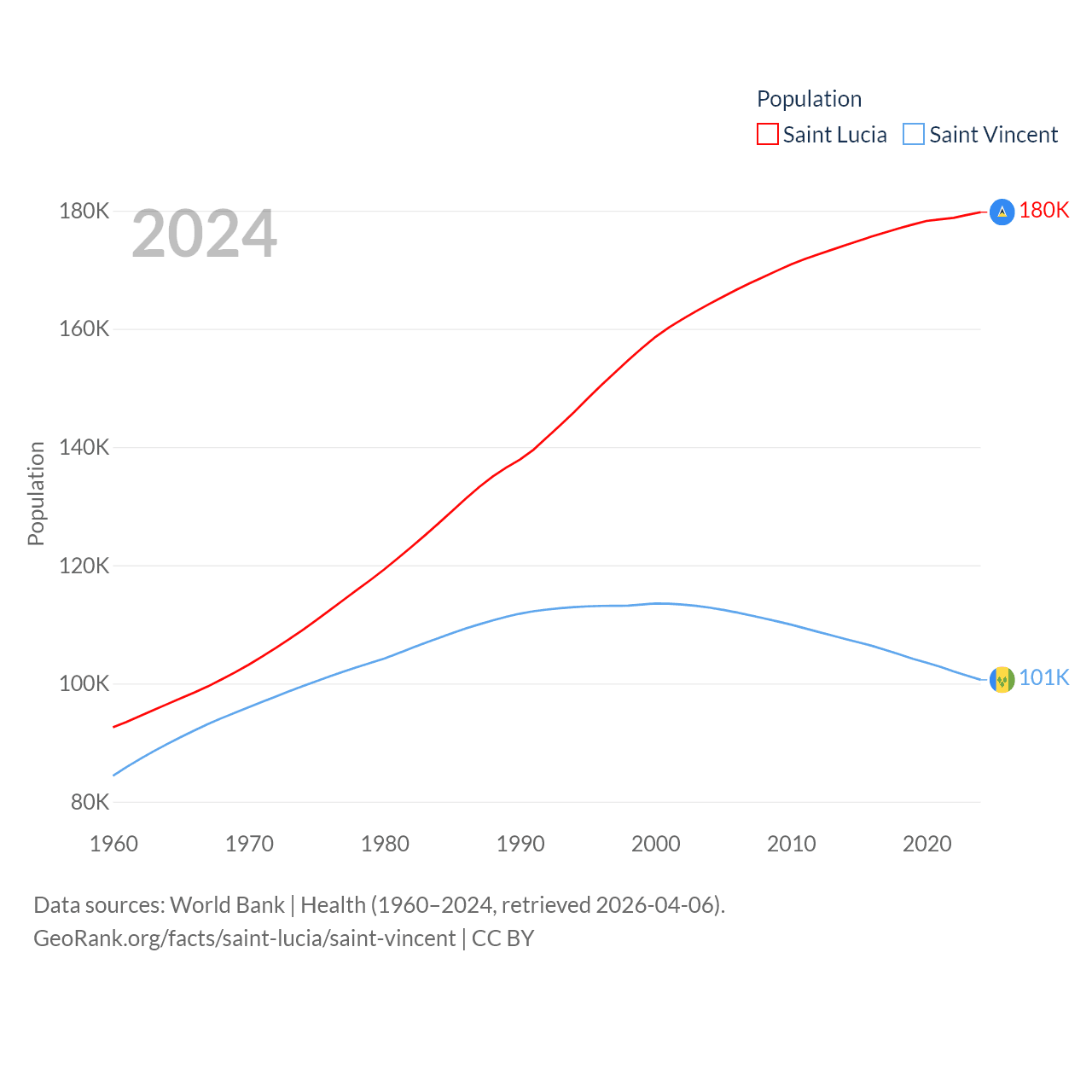 Saint Lucia has a population of 180K (ranked 178/197), compared with 101K in Saint Vincent (ranked 184/197). Saint Lucia's land area is 235.5 sq mi versus 150.6 sq mi for Saint Vincent (ranked 178th vs. 185th).