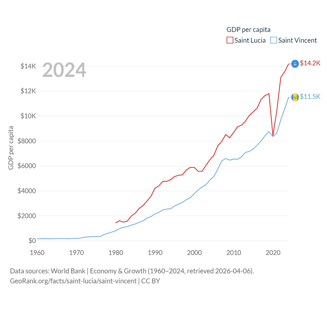 By GDP, Saint Lucia ranks 173/197 ($2.55B) and Saint Vincent ranks 186/197 ($1.16B). By GDP per capita, Saint Lucia ranks 70/197 ($14,182), while Saint Vincent ranks 81/197 ($11,501).