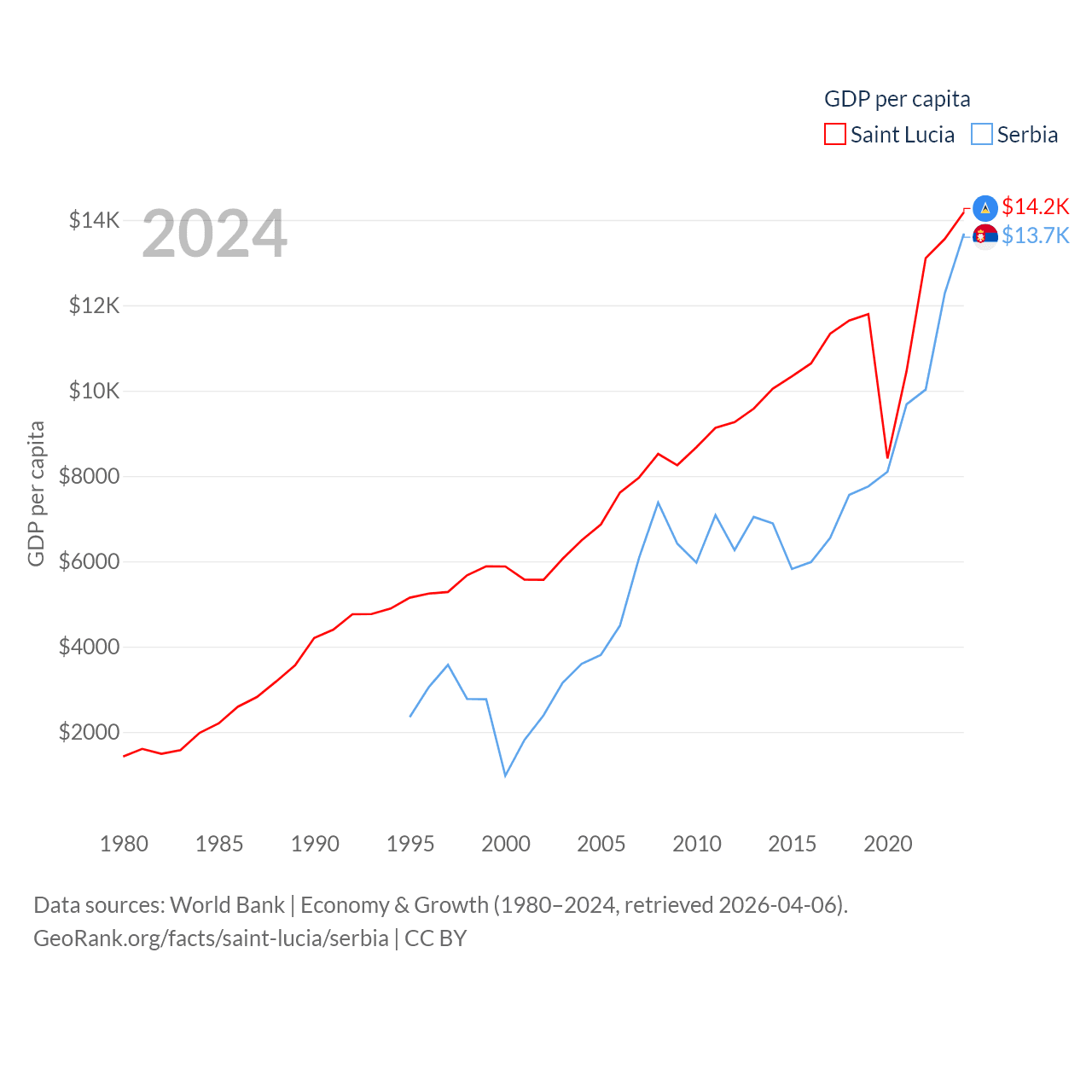 By GDP, Saint Lucia ranks 173/197 ($2.55B) and Serbia ranks 76/197 ($90.1B). By GDP per capita, Saint Lucia ranks 70/197 ($14,182), while Serbia ranks 73/197 ($13,679).