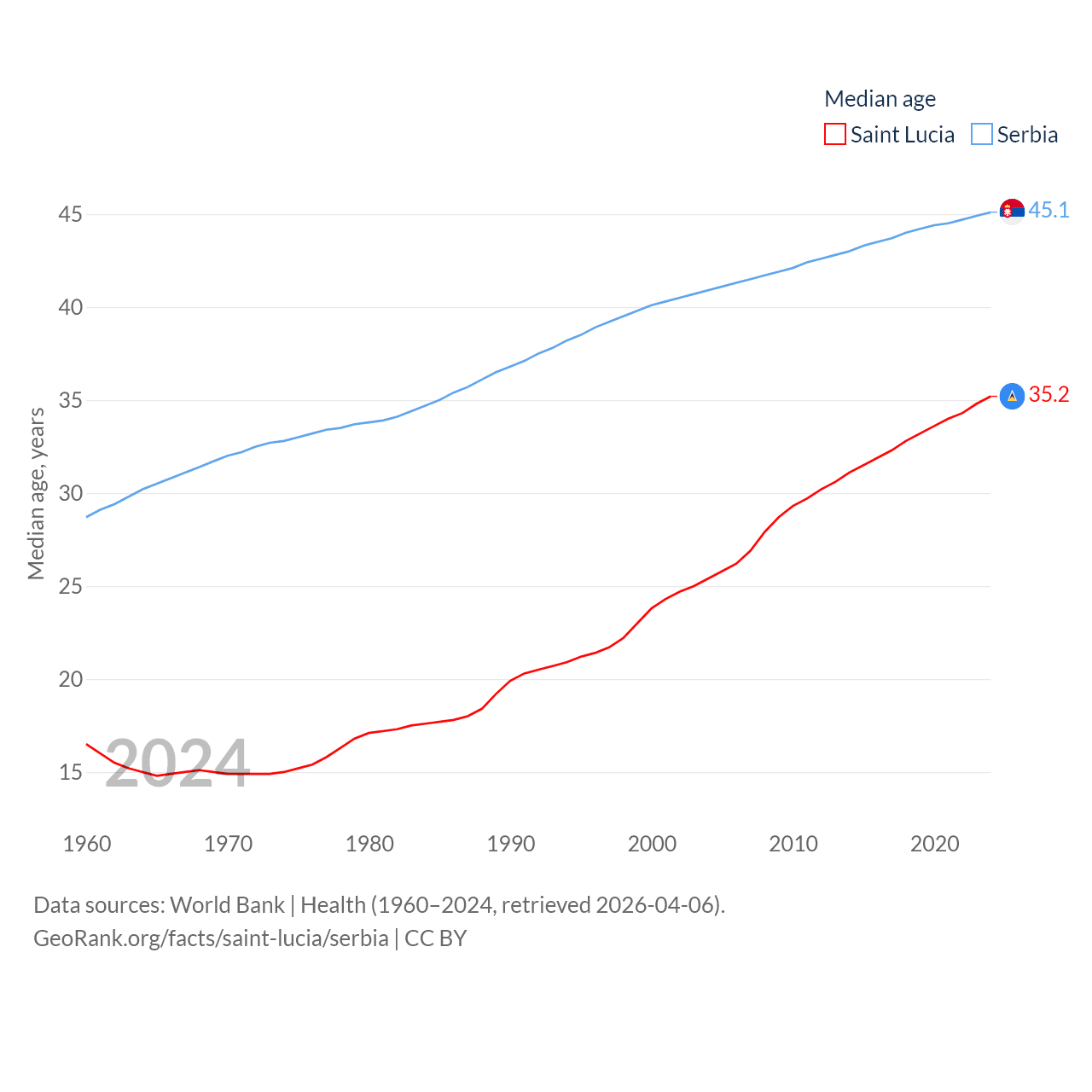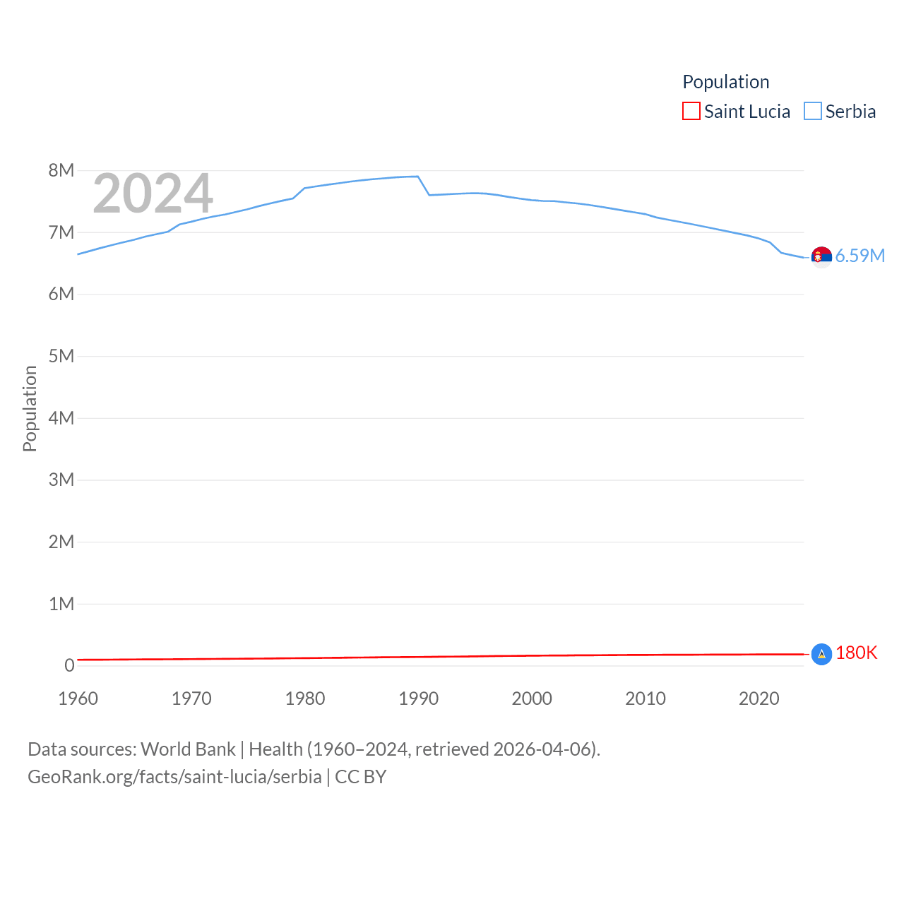 Saint Lucia has a population of 180K (ranked 178/197), compared with 6.59M in Serbia (ranked 109/197). Saint Lucia's land area is 235.5 sq mi versus 32,467 sq mi for Serbia (ranked 178th vs. 111th).