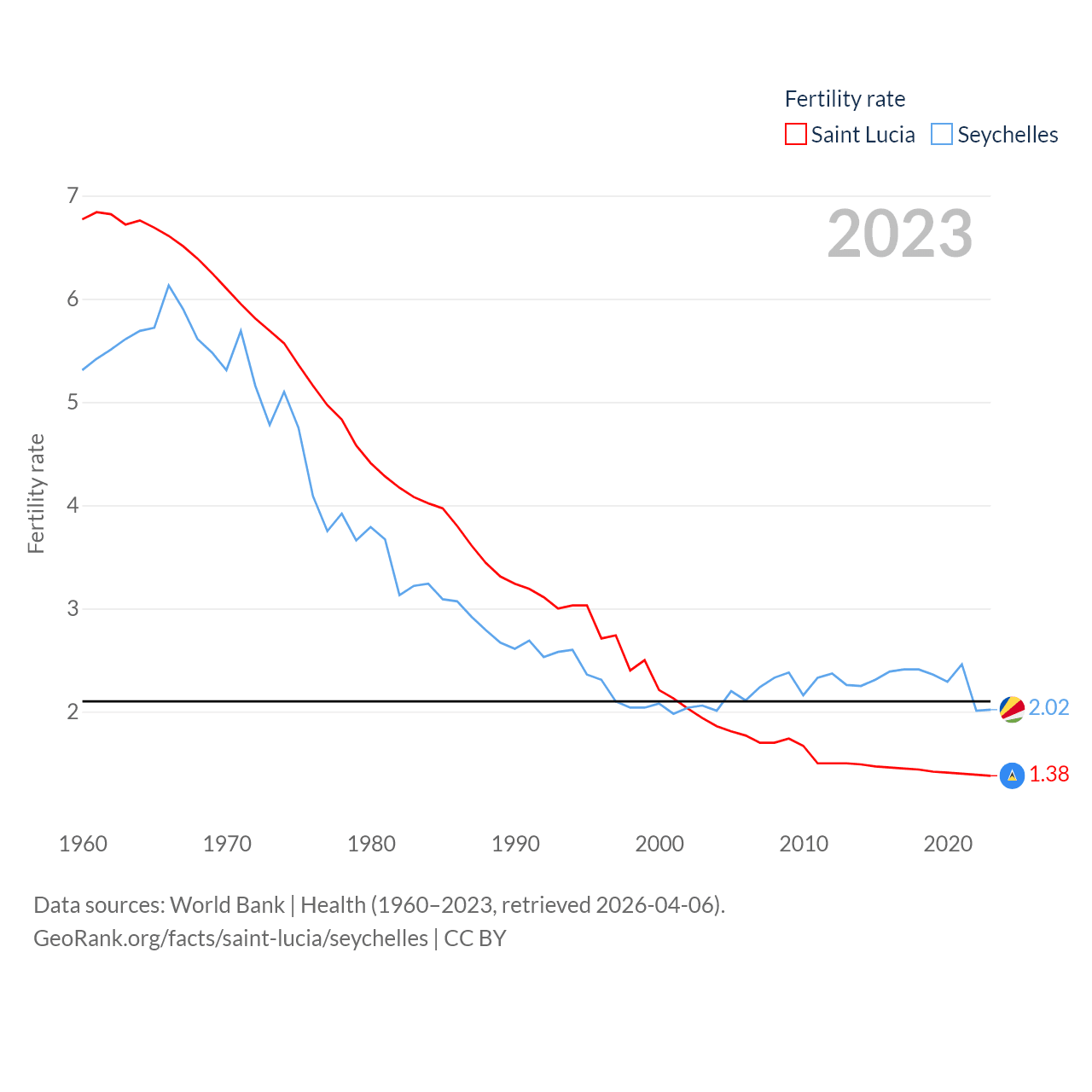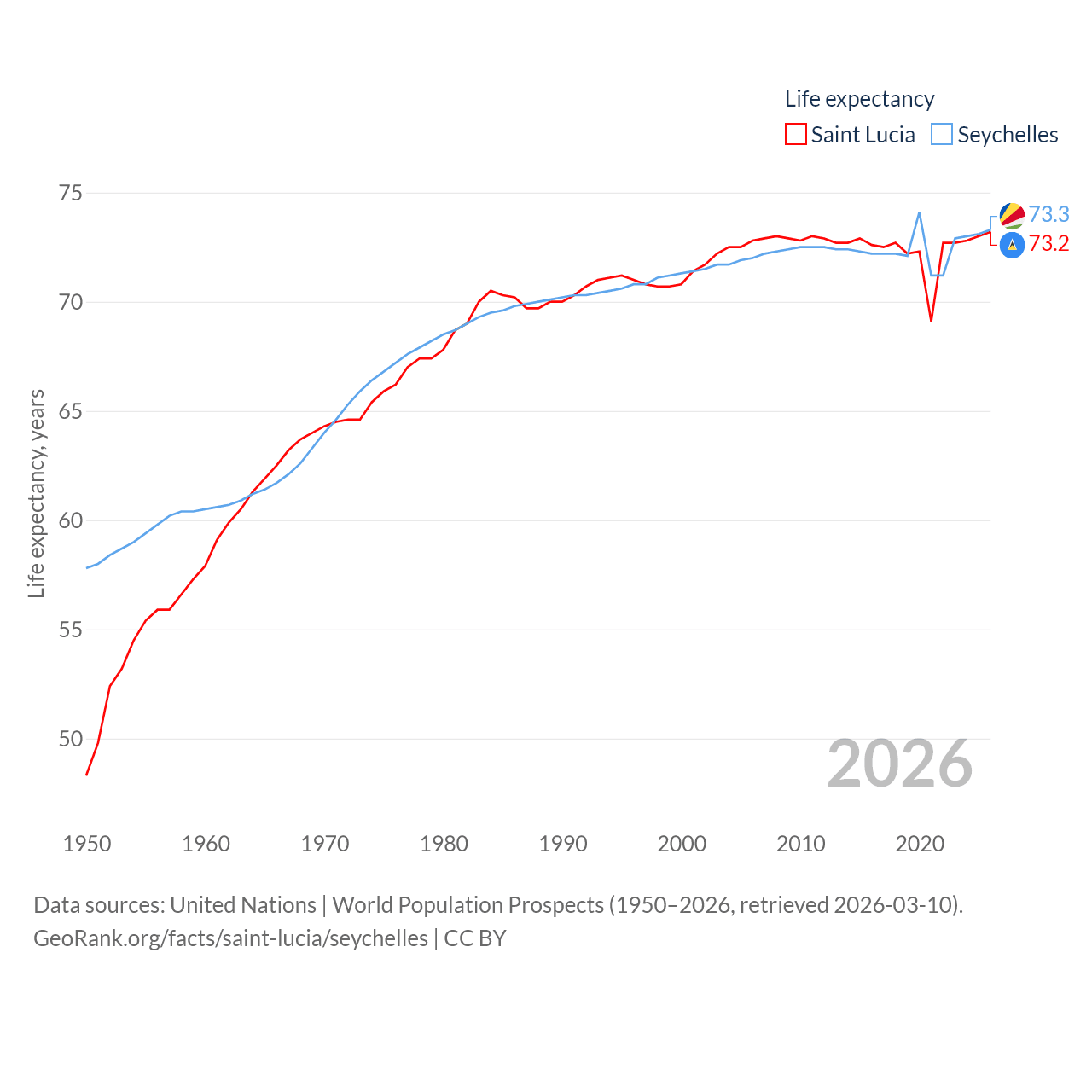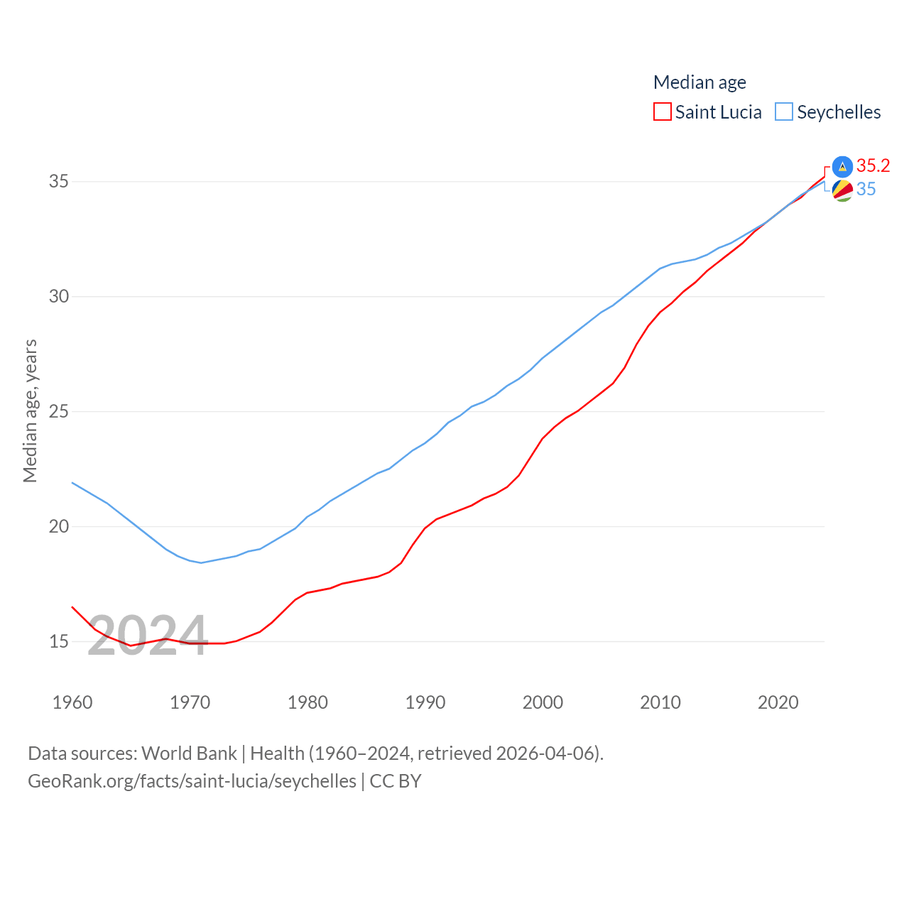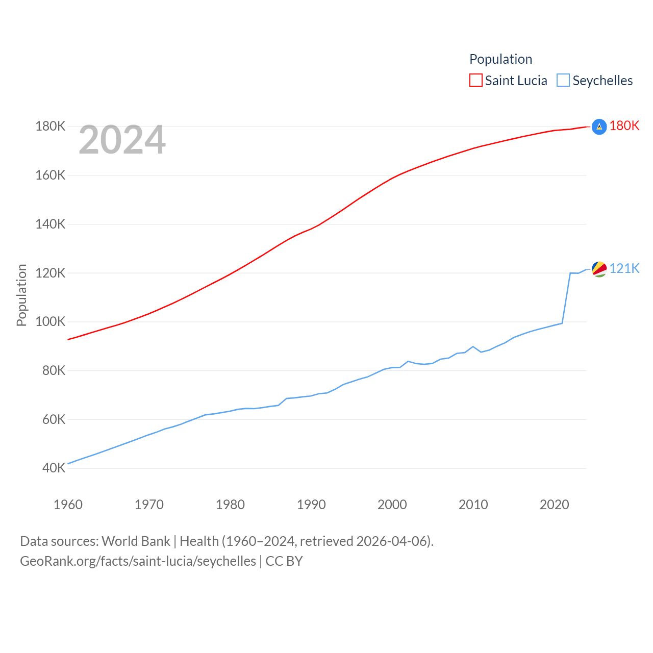 Saint Lucia has a population of 180K (ranked 178/197), compared with 121K in The Seychelles (ranked 181/197). Saint Lucia's land area is 235.5 sq mi versus 177.6 sq mi for The Seychelles (ranked 178th vs. 181st).