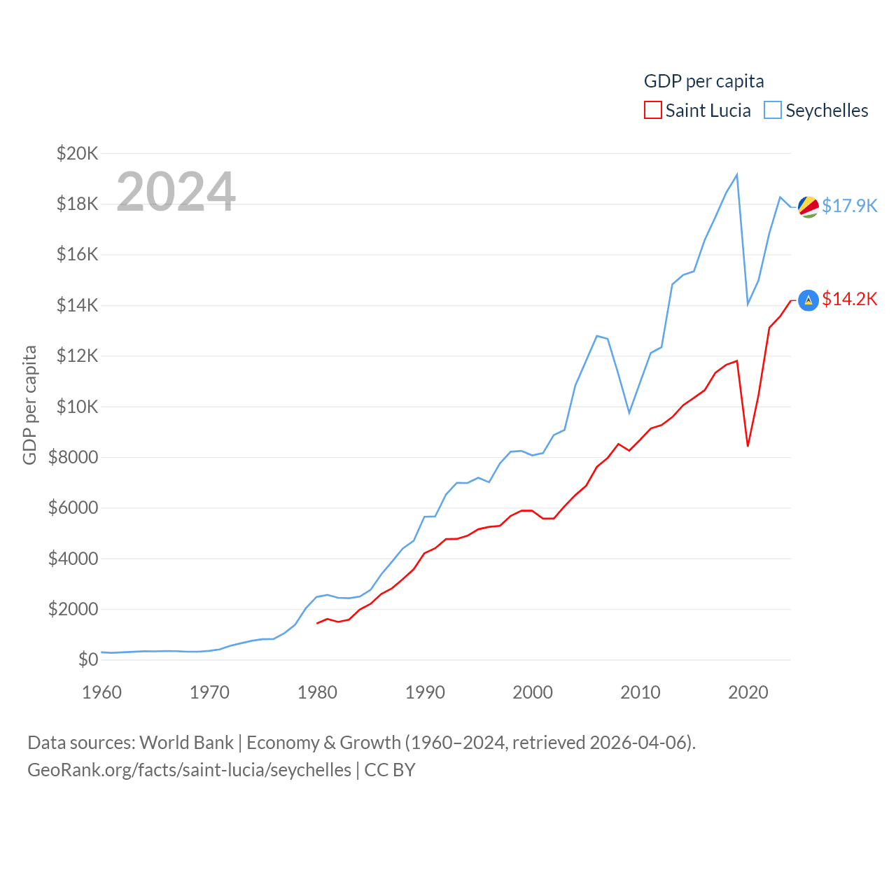 By GDP, Saint Lucia ranks 173/197 ($2.55B) and The Seychelles ranks 178/197 ($2.17B). By GDP per capita, Saint Lucia ranks 70/197 ($14,182), while The Seychelles ranks 63/197 ($17,859).