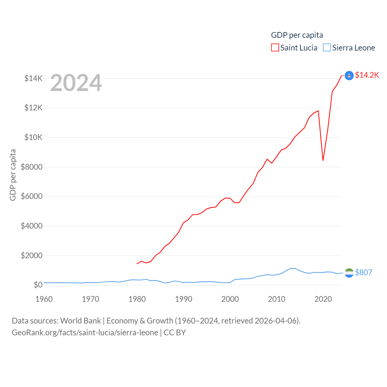 By GDP, Saint Lucia ranks 173/197 ($2.55B) and Sierra Leone ranks 160/197 ($6.97B). By GDP per capita, Saint Lucia ranks 70/197 ($14,182), while Sierra Leone ranks 186/197 ($807).