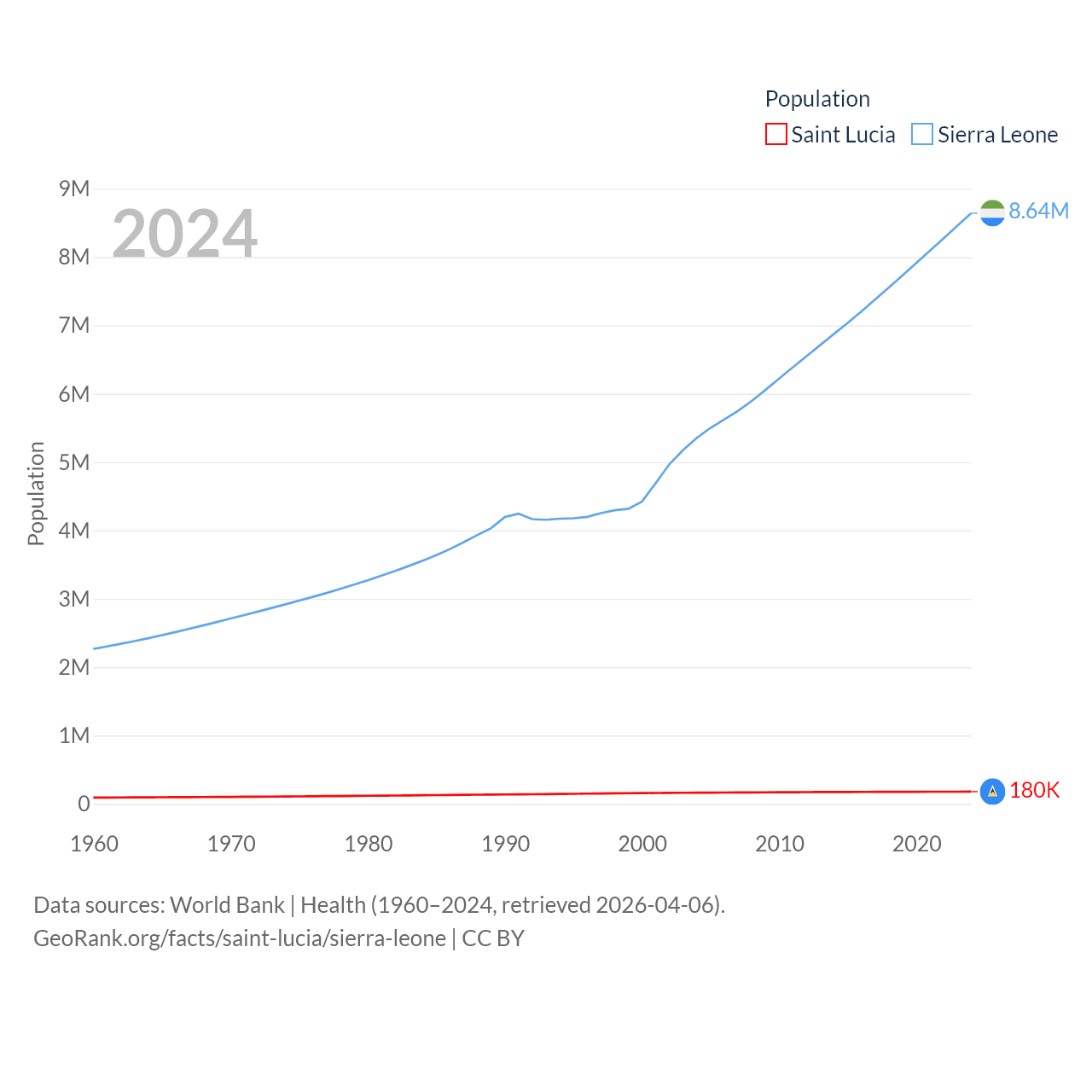 Saint Lucia has a population of 180K (ranked 178/197), compared with 8.64M in Sierra Leone (ranked 102/197). Saint Lucia's land area is 235.5 sq mi versus 27,869 sq mi for Sierra Leone (ranked 178th vs. 116th).