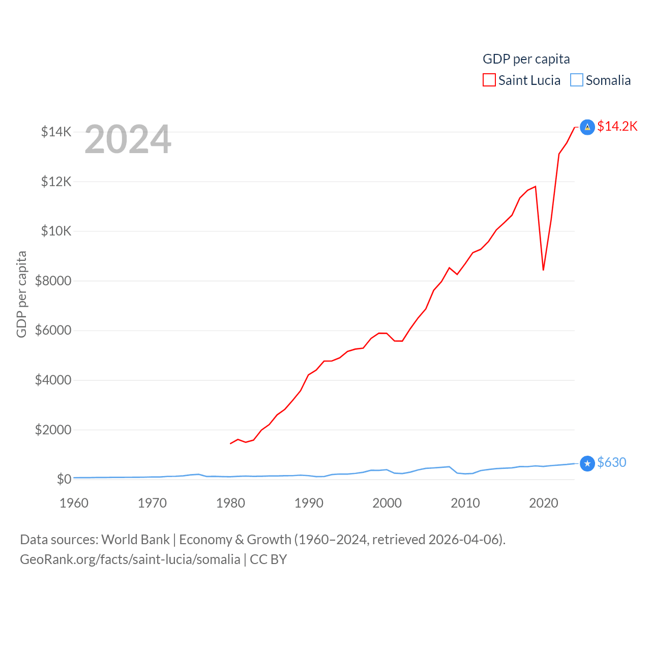 By GDP, Saint Lucia ranks 173/197 ($2.55B) and Somalia ranks 150/197 ($12B). By GDP per capita, Saint Lucia ranks 70/197 ($14,182), while Somalia ranks 192/197 ($630).