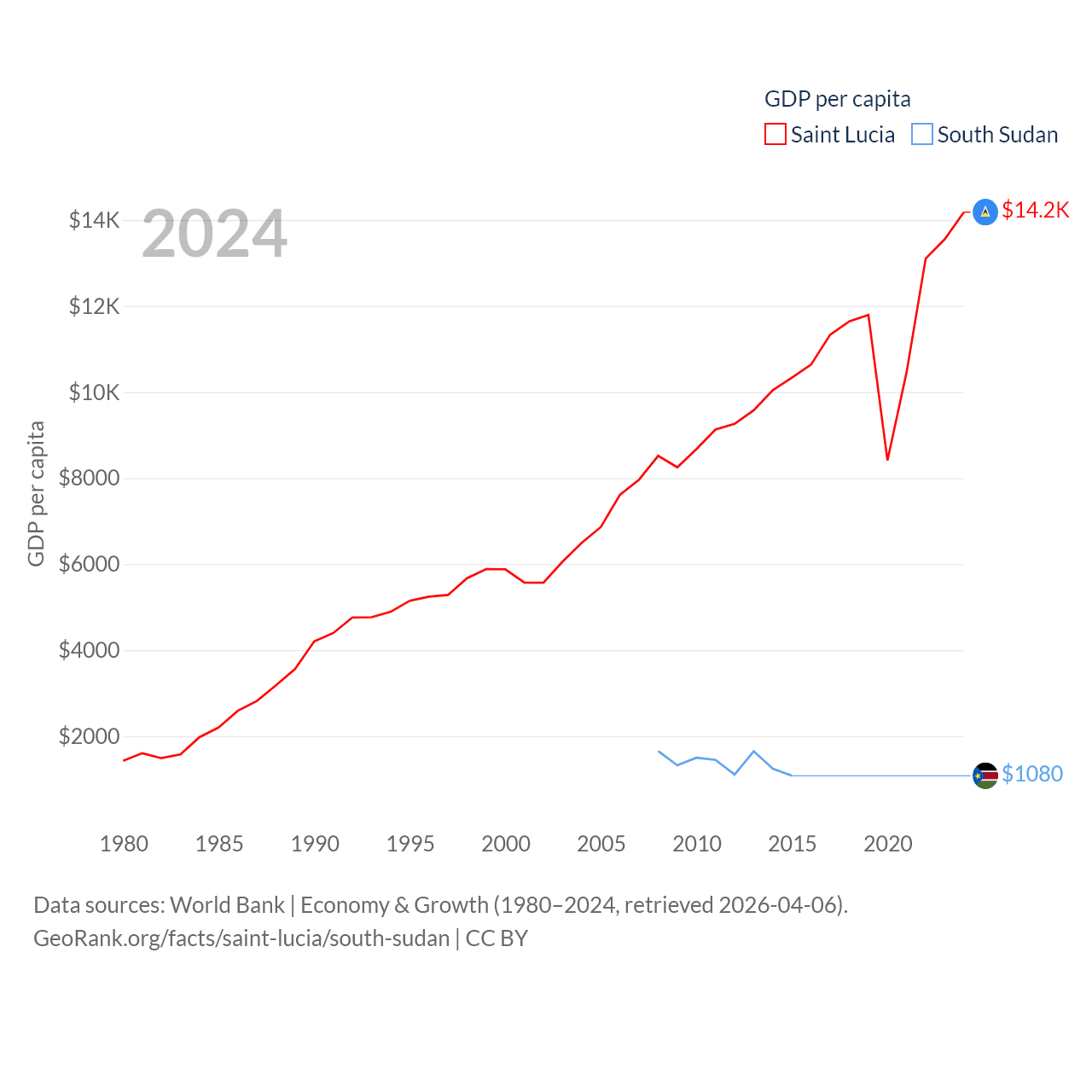 By GDP, Saint Lucia ranks 173/197 ($2.55B) and South Sudan ranks 149/197 ($12B). By GDP per capita, Saint Lucia ranks 70/197 ($14,182), while South Sudan ranks 175/197 ($1,080).