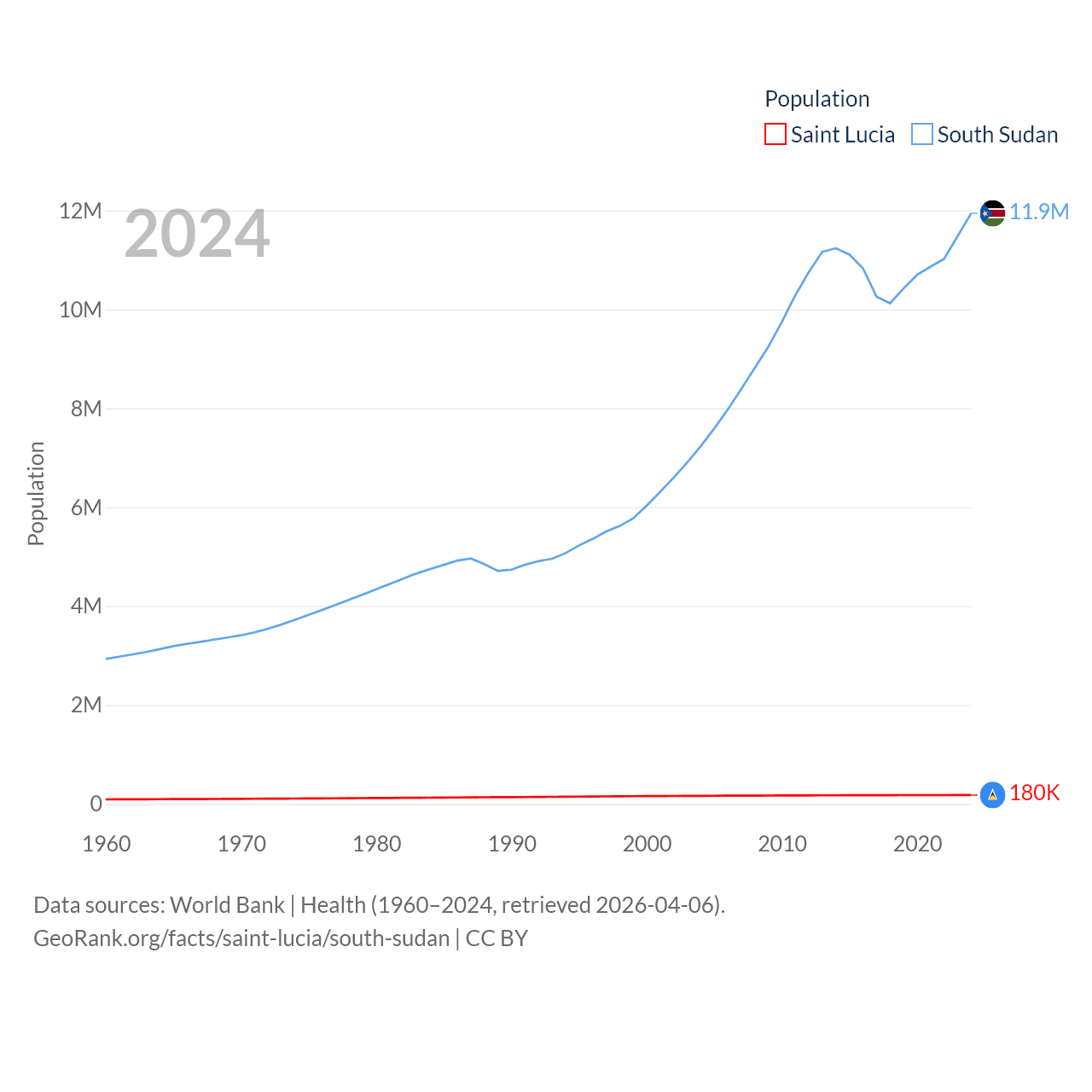 Saint Lucia has a population of 180K (ranked 178/197), compared with 11.9M in South Sudan (ranked 81/197). Saint Lucia's land area is 235.5 sq mi versus 243,990 sq mi for South Sudan (ranked 178th vs. 41st).