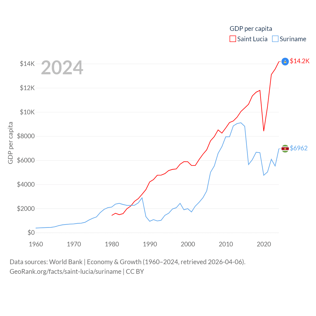 By GDP, Saint Lucia ranks 173/197 ($2.55B) and Suriname ranks 164/197 ($4.42B). By GDP per capita, Saint Lucia ranks 70/197 ($14,182), while Suriname ranks 102/197 ($6,962).