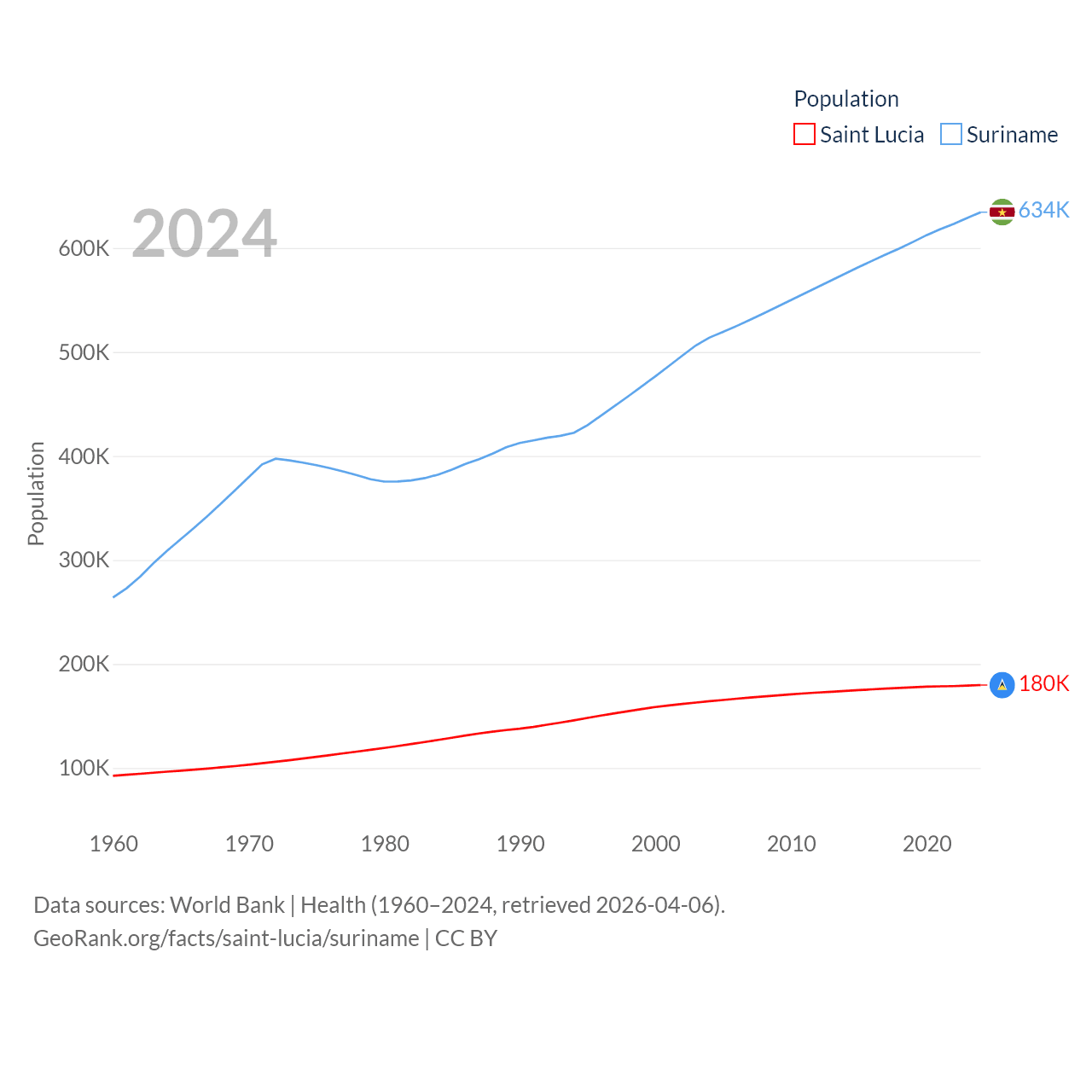 Saint Lucia has a population of 180K (ranked 178/197), compared with 634K in Suriname (ranked 165/197). Saint Lucia's land area is 235.5 sq mi versus 61,972 sq mi for Suriname (ranked 178th vs. 90th).