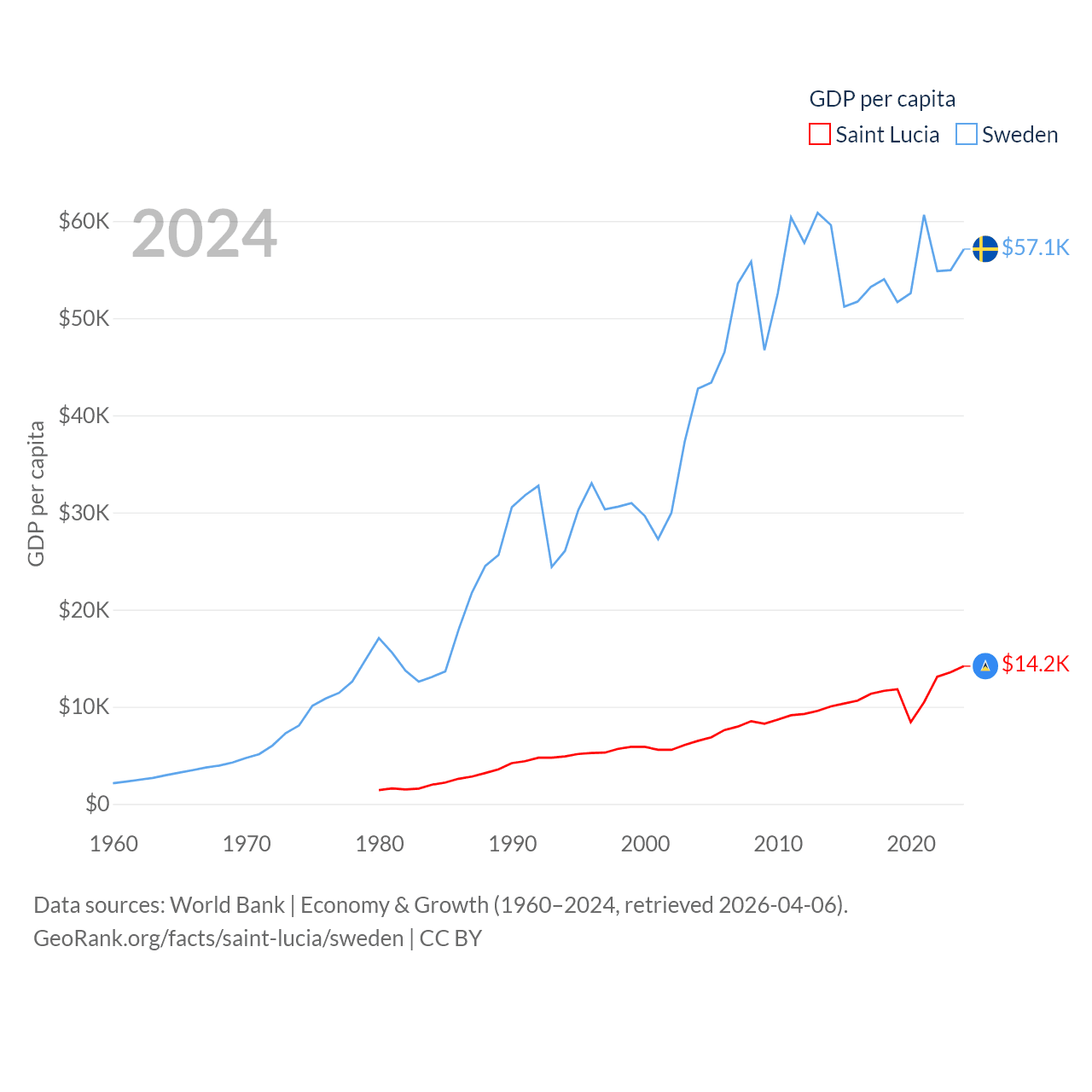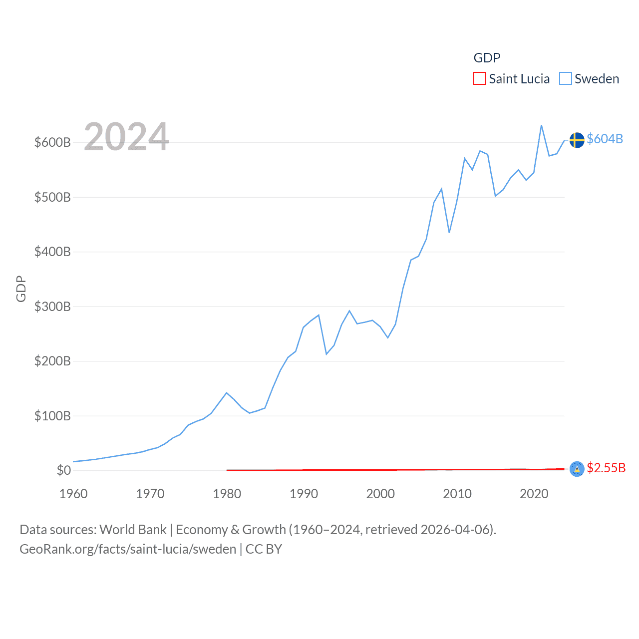By GDP, Saint Lucia ranks 173/197 ($2.55B) and Sweden ranks 26/197 ($604B). By GDP per capita, Saint Lucia ranks 70/197 ($14,182), while Sweden ranks 17/197 ($57,117).
