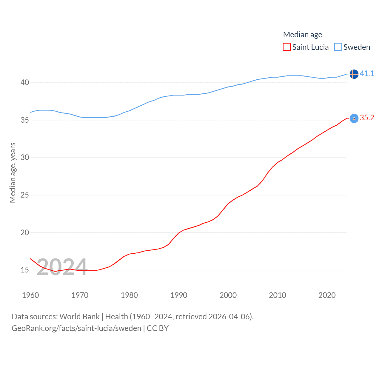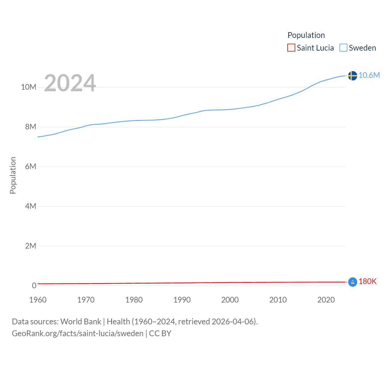 Saint Lucia has a population of 180K (ranked 178/197), compared with 10.6M in Sweden (ranked 93/197). Saint Lucia's land area is 235.5 sq mi versus 157,248 sq mi for Sweden (ranked 178th vs. 58th).