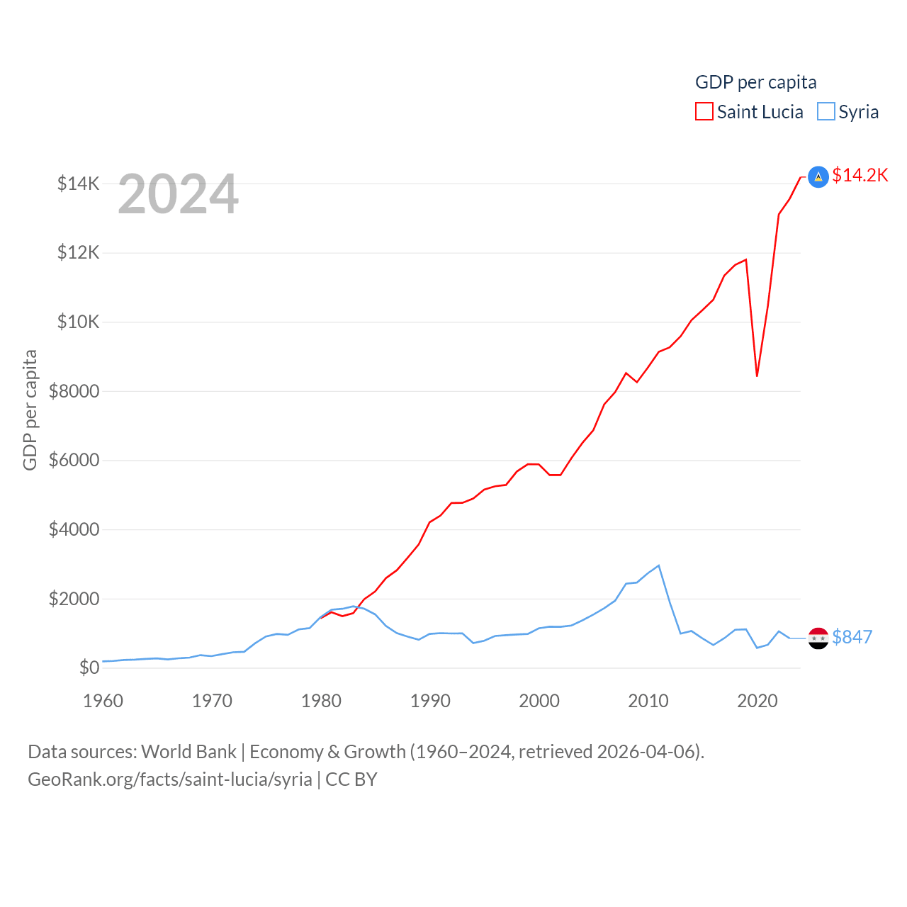By GDP, Saint Lucia ranks 173/197 ($2.55B) and Syria ranks 129/197 ($20B). By GDP per capita, Saint Lucia ranks 70/197 ($14,182), while Syria ranks 185/197 ($847).