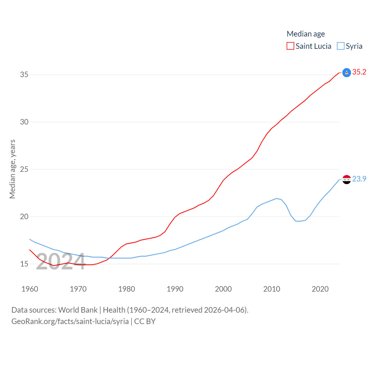 Saint Lucia has a population of 180K (ranked 178/197), compared with 24.7M in Syria (ranked 57/197). Saint Lucia's land area is 235.5 sq mi versus 70,900 sq mi for Syria (ranked 178th vs. 87th).