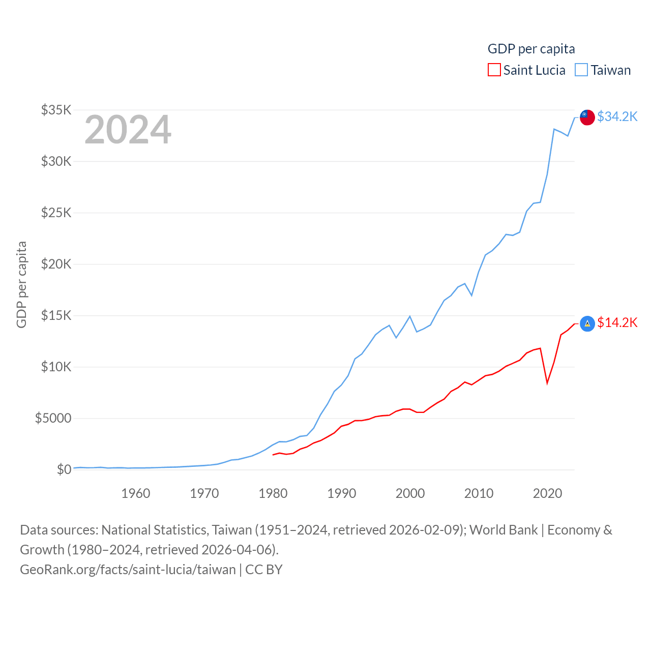 By GDP, Saint Lucia ranks 173/197 ($2.55B) and Taiwan ranks 22/197 ($802B). By GDP per capita, Saint Lucia ranks 70/197 ($14,182), while Taiwan ranks 35/197 ($34,238).