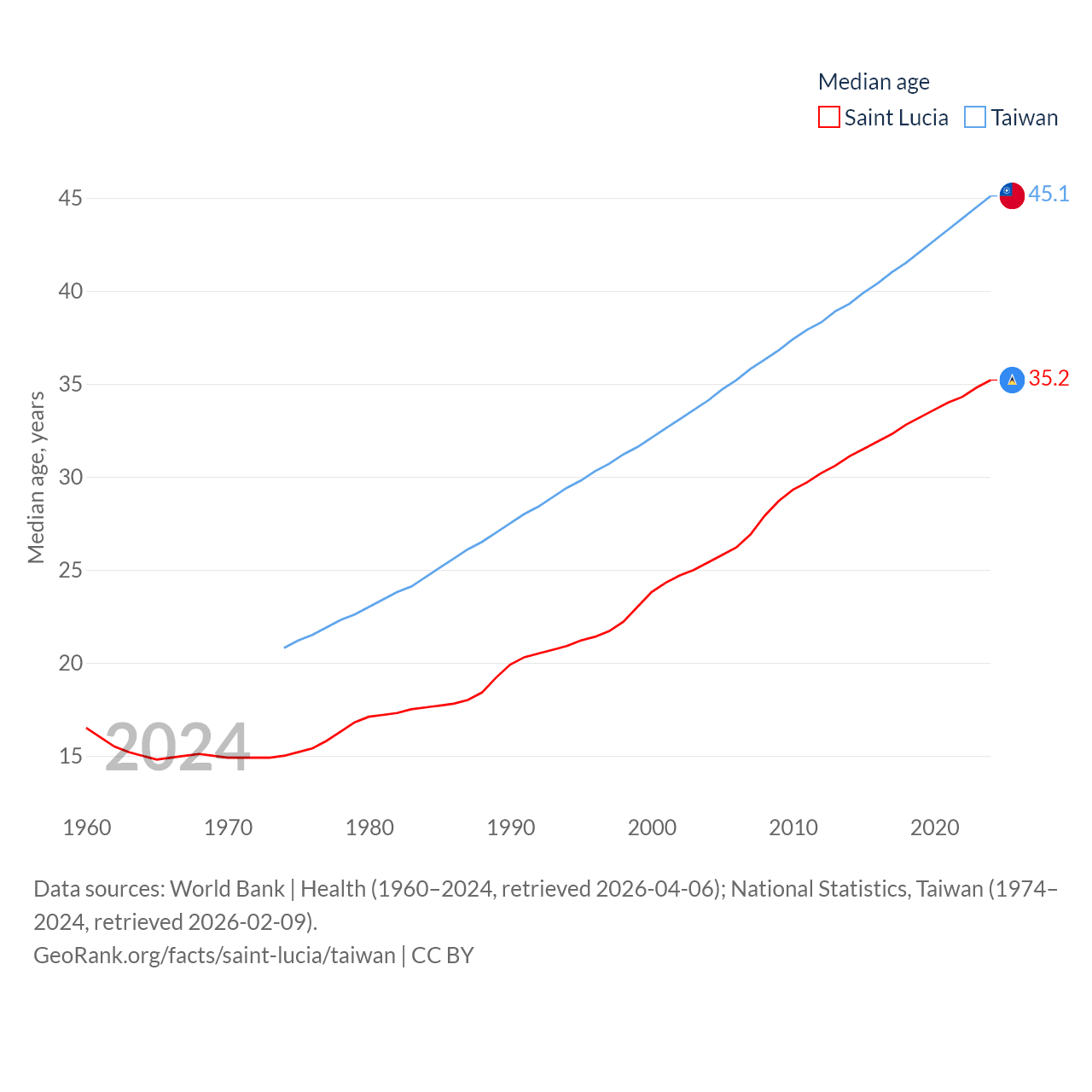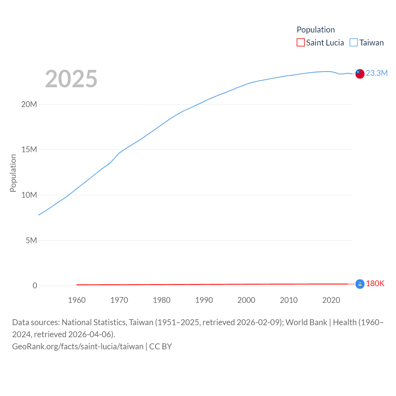 Saint Lucia has a population of 180K (ranked 178/197), compared with 23.3M in Taiwan (ranked 60/197). Saint Lucia's land area is 235.5 sq mi versus 13,976 sq mi for Taiwan (ranked 178th vs. 133rd).