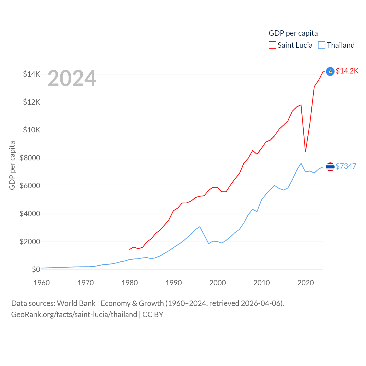 By GDP, Saint Lucia ranks 173/197 ($2.55B) and Thailand ranks 31/197 ($527B). By GDP per capita, Saint Lucia ranks 70/197 ($14,182), while Thailand ranks 100/197 ($7,347).