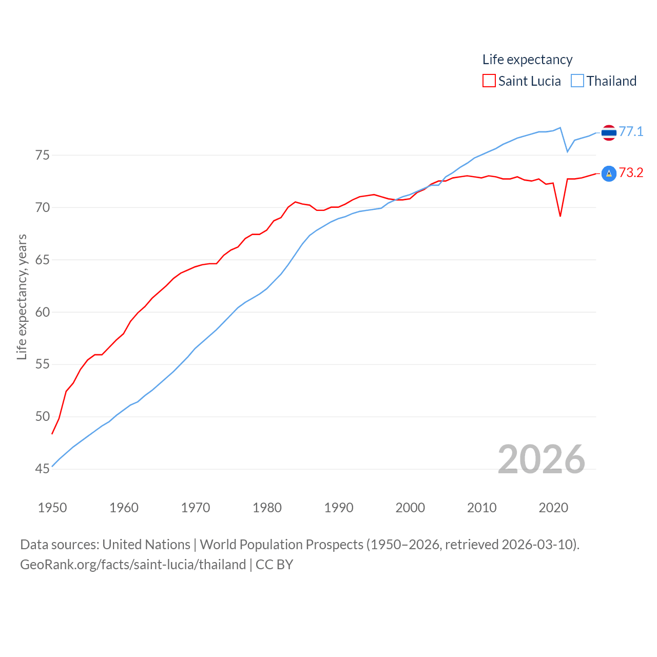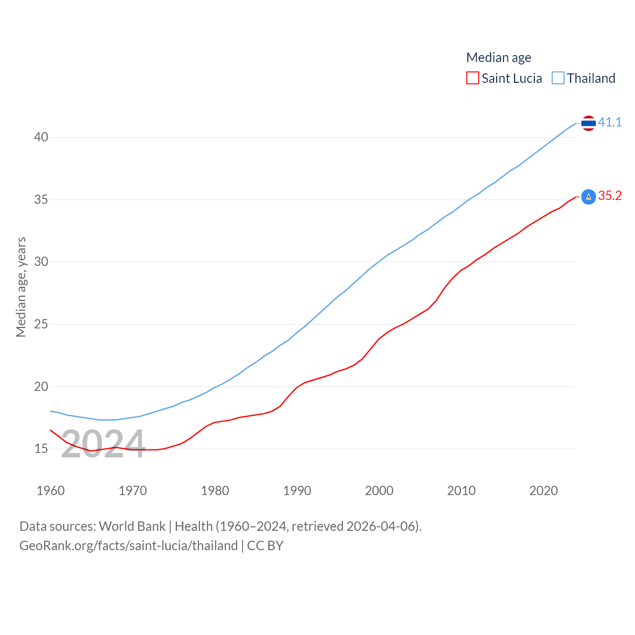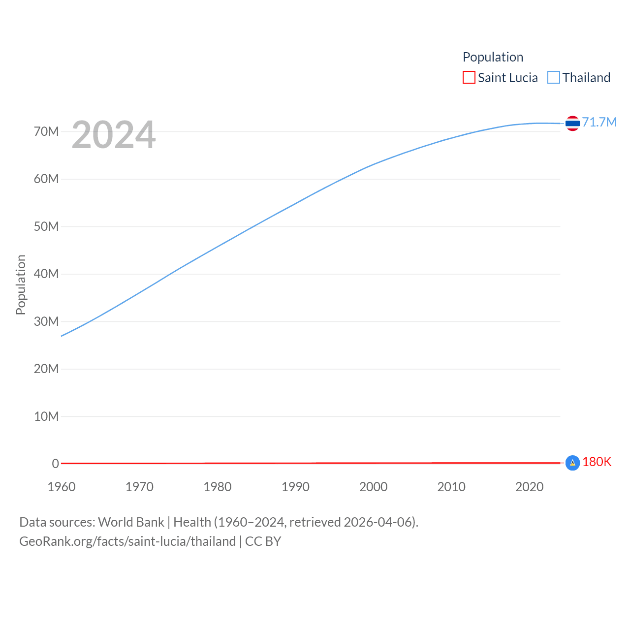 Saint Lucia has a population of 180K (ranked 178/197), compared with 71.7M in Thailand (ranked 20/197). Saint Lucia's land area is 235.5 sq mi versus 197,256 sq mi for Thailand (ranked 178th vs. 50th).