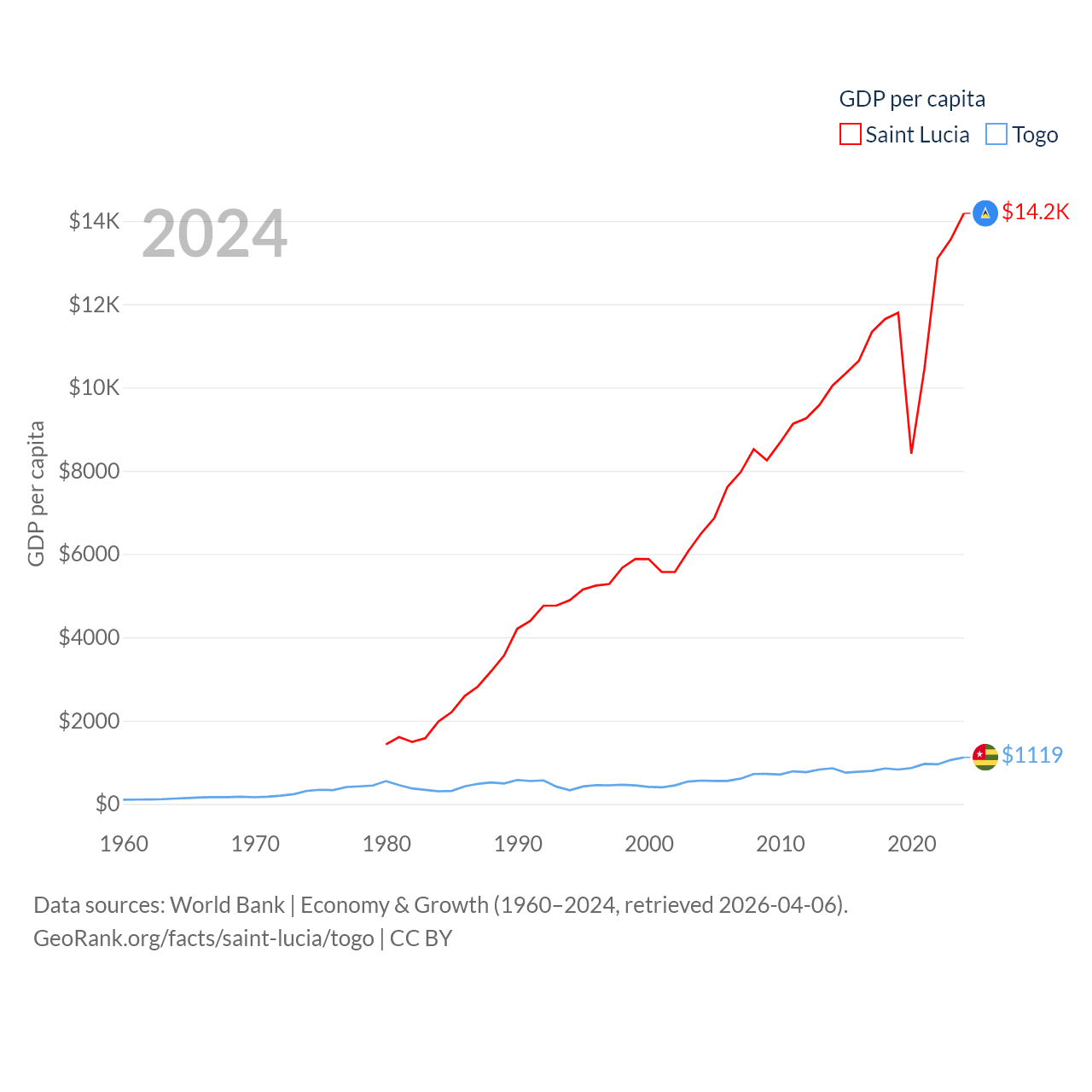 By GDP, Saint Lucia ranks 173/197 ($2.55B) and Togo ranks 154/197 ($10.7B). By GDP per capita, Saint Lucia ranks 70/197 ($14,182), while Togo ranks 172/197 ($1,119).