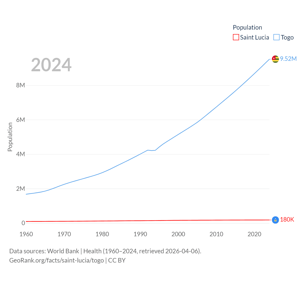 Saint Lucia has a population of 180K (ranked 178/197), compared with 9.52M in Togo (ranked 98/197). Saint Lucia's land area is 235.5 sq mi versus 21,000 sq mi for Togo (ranked 178th vs. 124th).