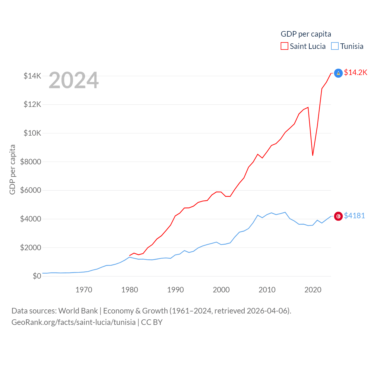By GDP, Saint Lucia ranks 173/197 ($2.55B) and Tunisia ranks 93/197 ($51.3B). By GDP per capita, Saint Lucia ranks 70/197 ($14,182), while Tunisia ranks 129/197 ($4,181).