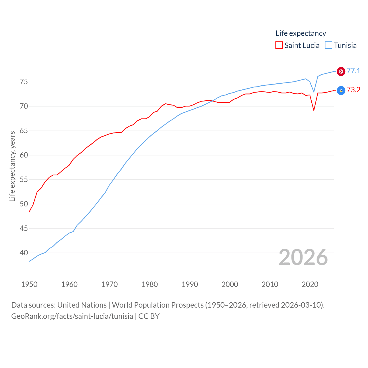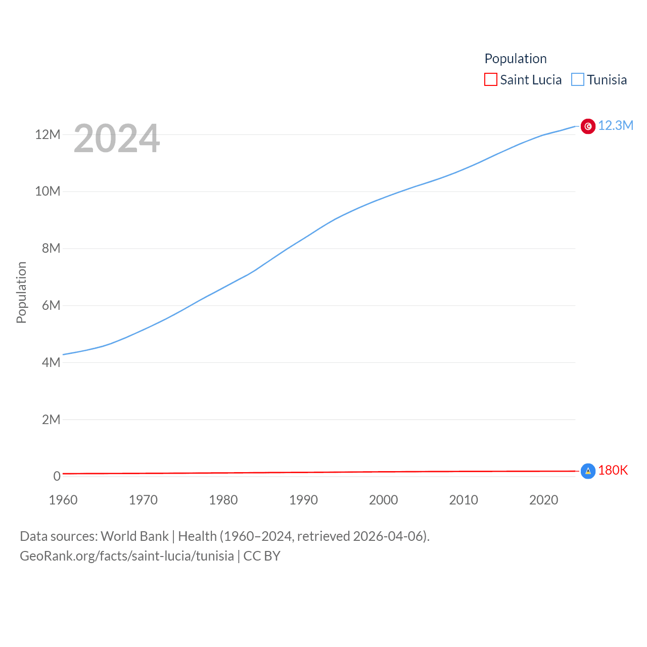 Saint Lucia has a population of 180K (ranked 178/197), compared with 12.3M in Tunisia (ranked 80/197). Saint Lucia's land area is 235.5 sq mi versus 59,985 sq mi for Tunisia (ranked 178th vs. 91st).