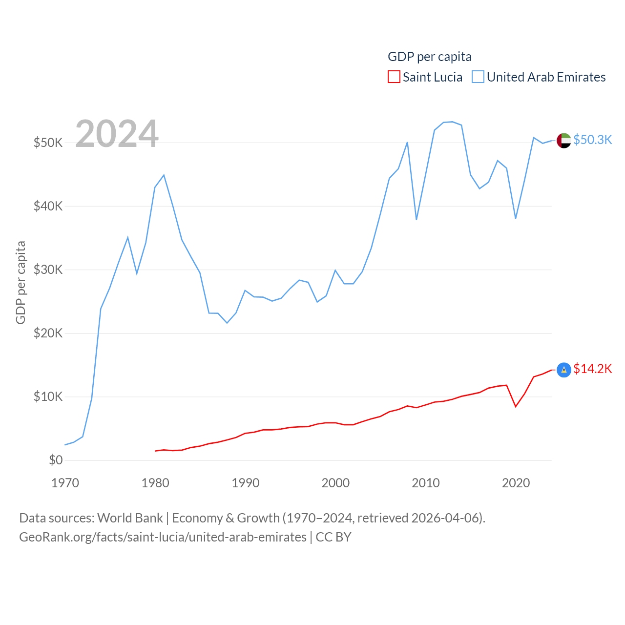 By GDP, Saint Lucia ranks 173/197 ($2.55B) and The United Arab Emirates ranks 27/197 ($552B). By GDP per capita, Saint Lucia ranks 70/197 ($14,182), while The United Arab Emirates ranks 24/197 ($50,274).