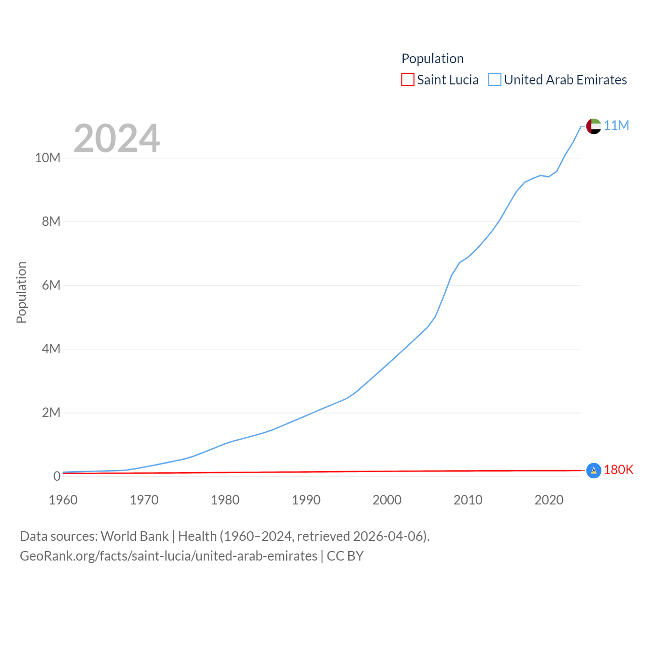 Saint Lucia has a population of 180K (ranked 178/197), compared with 11M in The United Arab Emirates (ranked 86/197). Saint Lucia's land area is 235.5 sq mi versus 27,421 sq mi for The United Arab Emirates (ranked 178th vs. 117th).