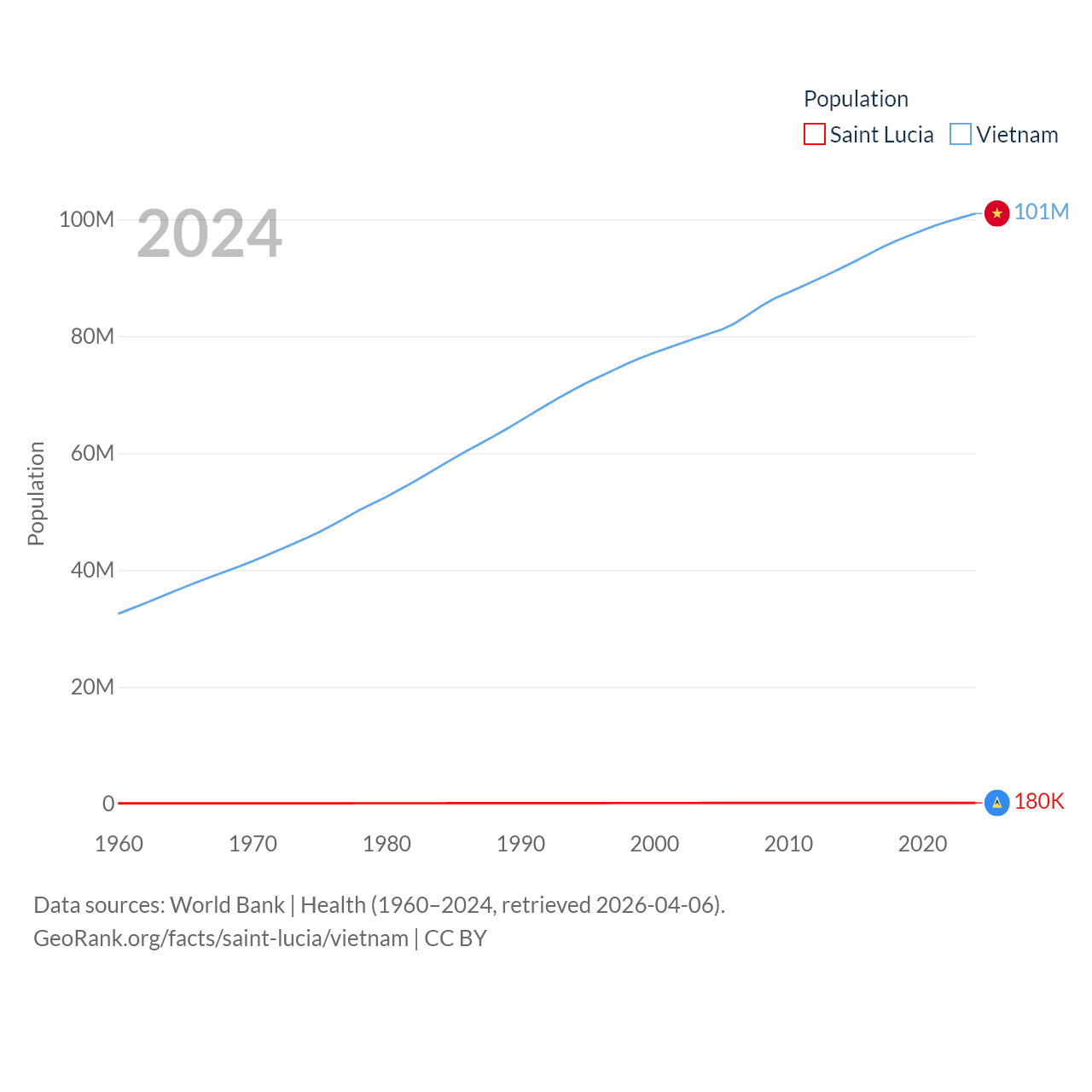 Saint Lucia has a population of 180K (ranked 178/197), compared with 101M in Vietnam (ranked 16/197). Saint Lucia's land area is 235.5 sq mi versus 121,016 sq mi for Vietnam (ranked 178th vs. 67th).