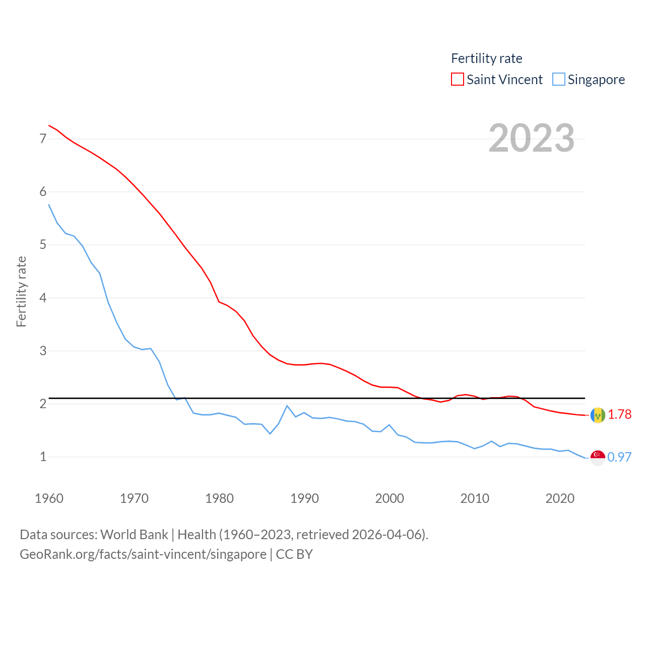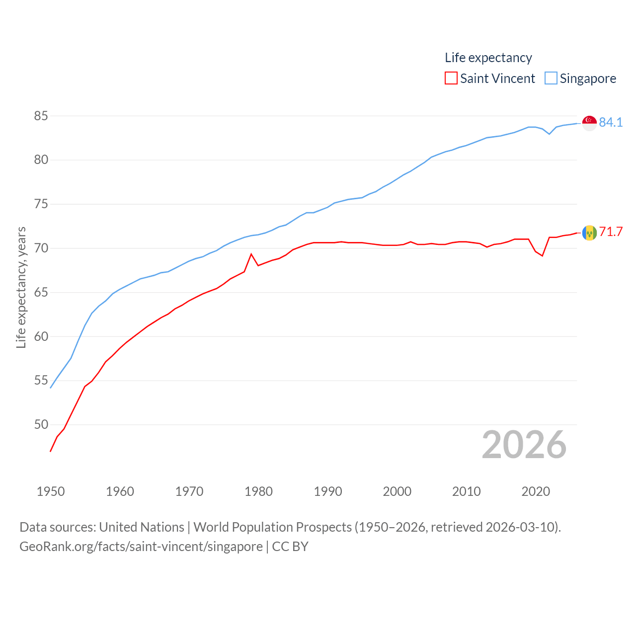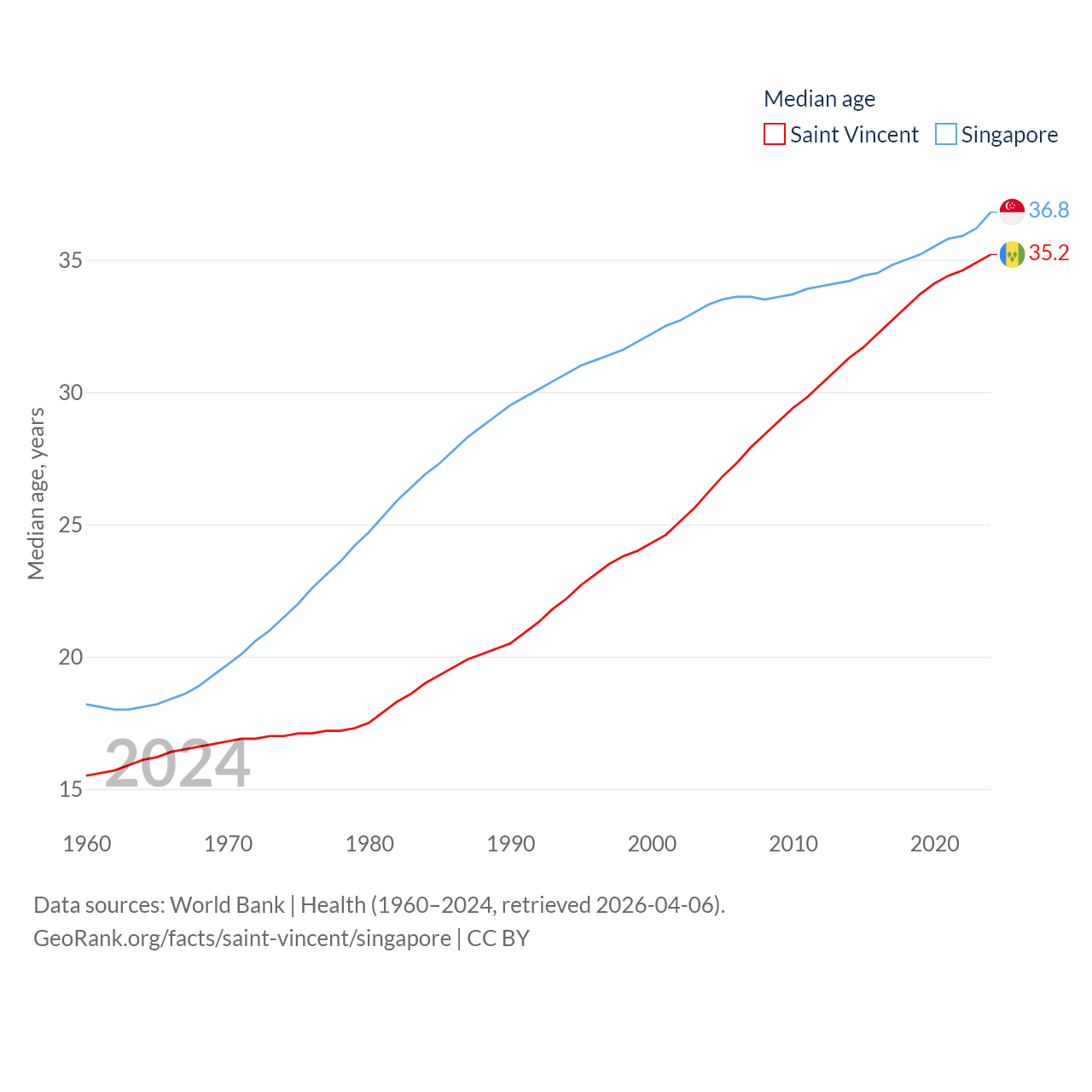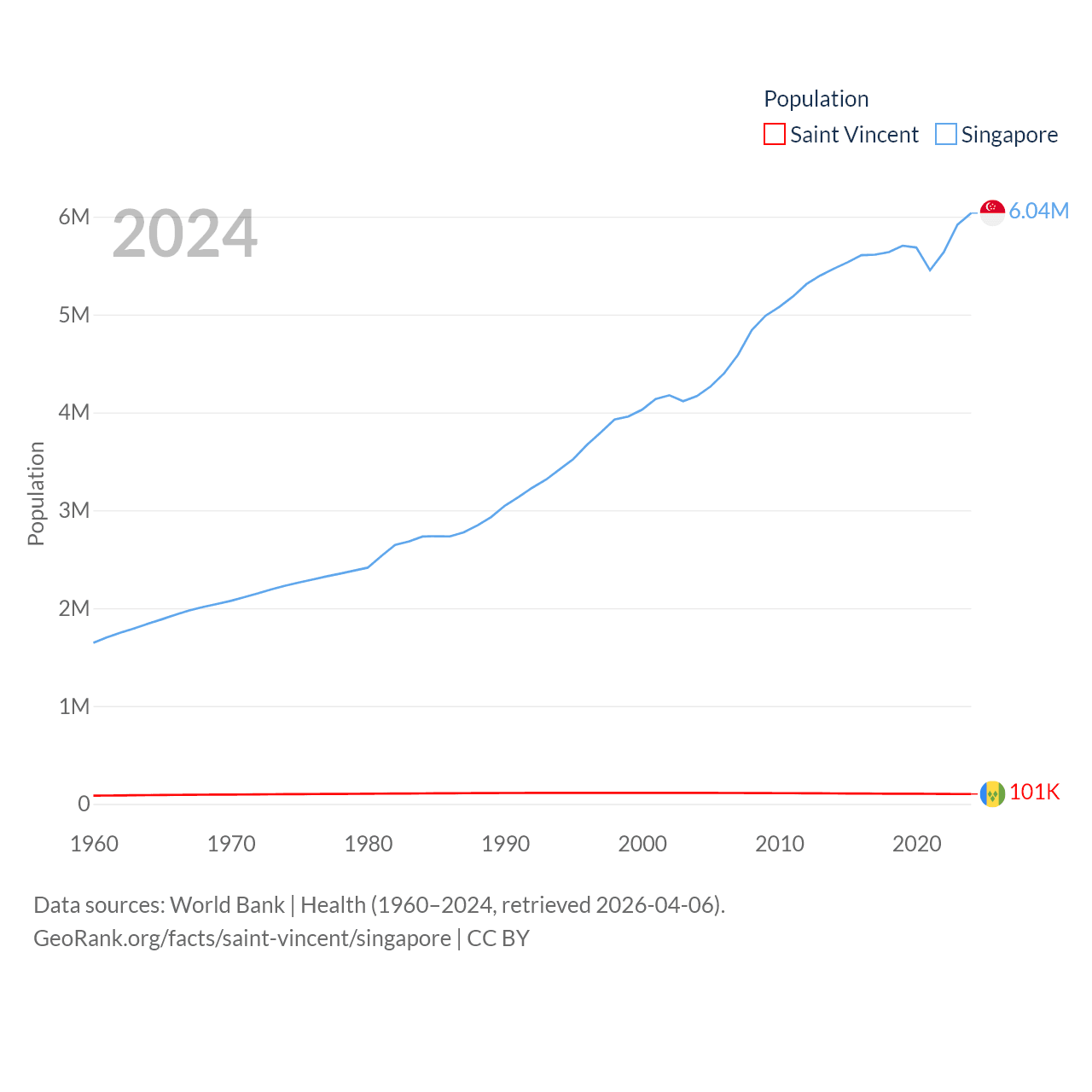 Saint Vincent has a population of 101K (ranked 184/197), compared with 6.04M in Singapore (ranked 113/197). Saint Vincent's land area is 150.6 sq mi versus 277.2 sq mi for Singapore (ranked 185th vs. 177th).