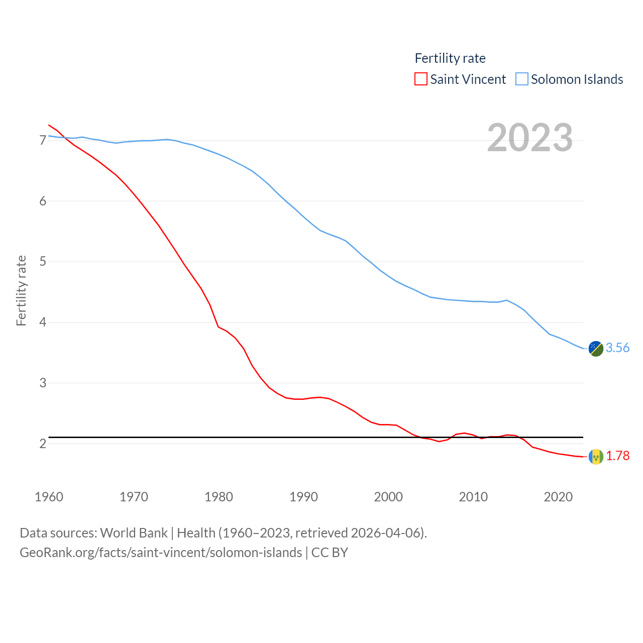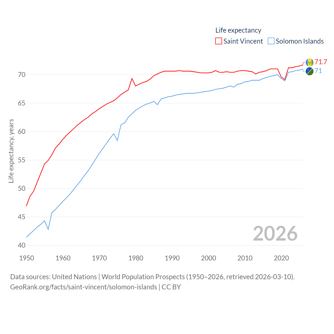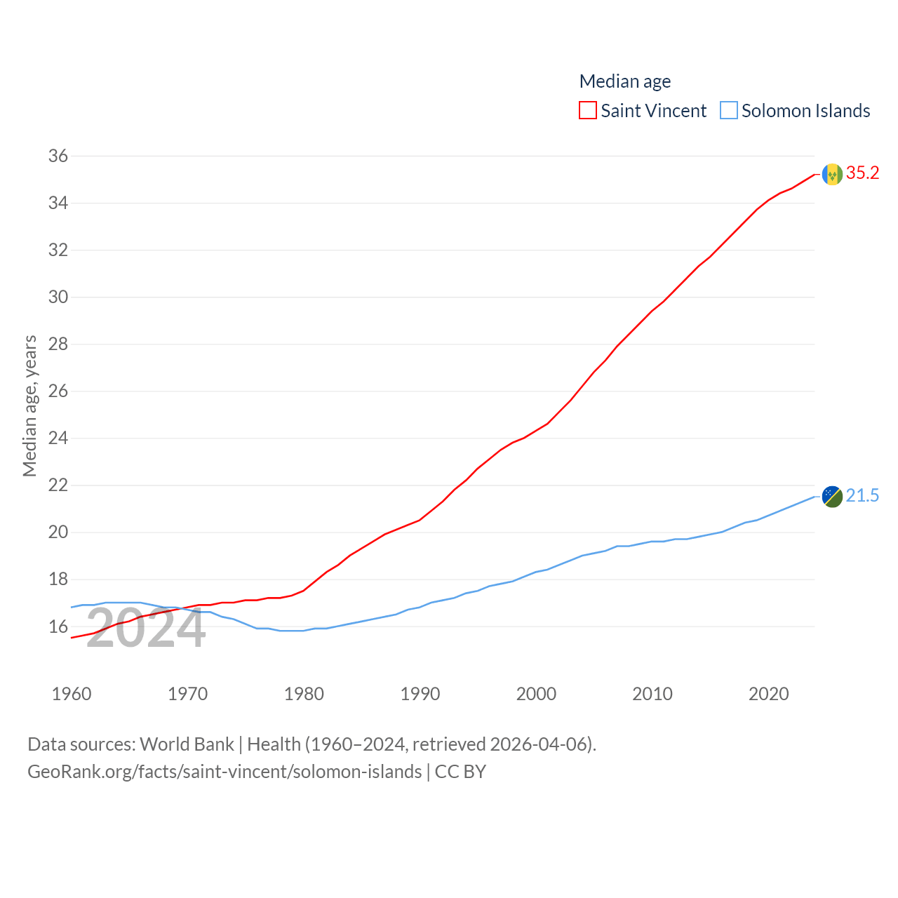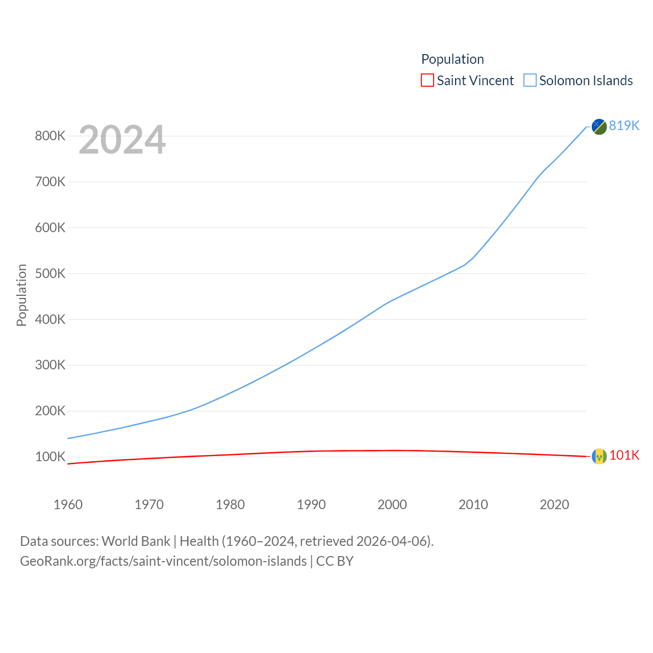 Saint Vincent has a population of 101K (ranked 184/197), compared with 819K in The Solomon Islands (ranked 162/197). Saint Vincent's land area is 150.6 sq mi versus 10,807 sq mi for The Solomon Islands (ranked 185th vs. 141st).
