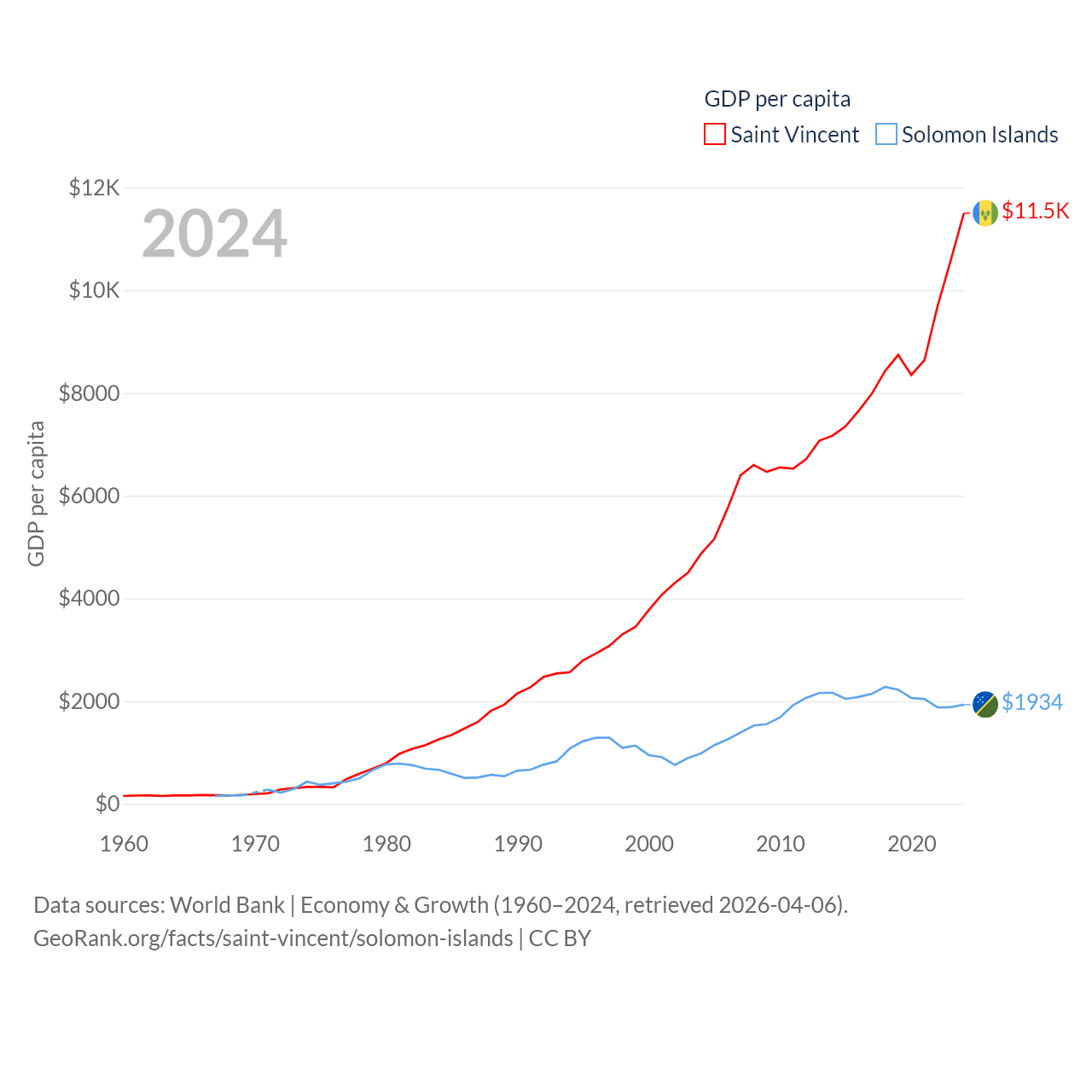 By GDP, Saint Vincent ranks 186/197 ($1.16B) and The Solomon Islands ranks 182/197 ($1.58B). By GDP per capita, Saint Vincent ranks 81/197 ($11,501), while The Solomon Islands ranks 157/197 ($1,934).