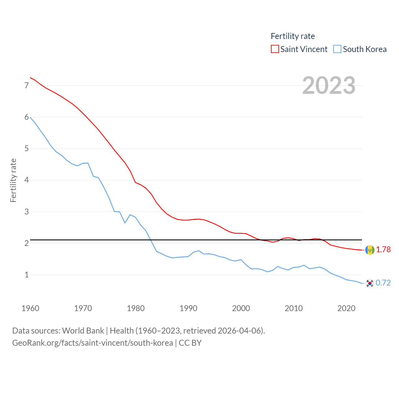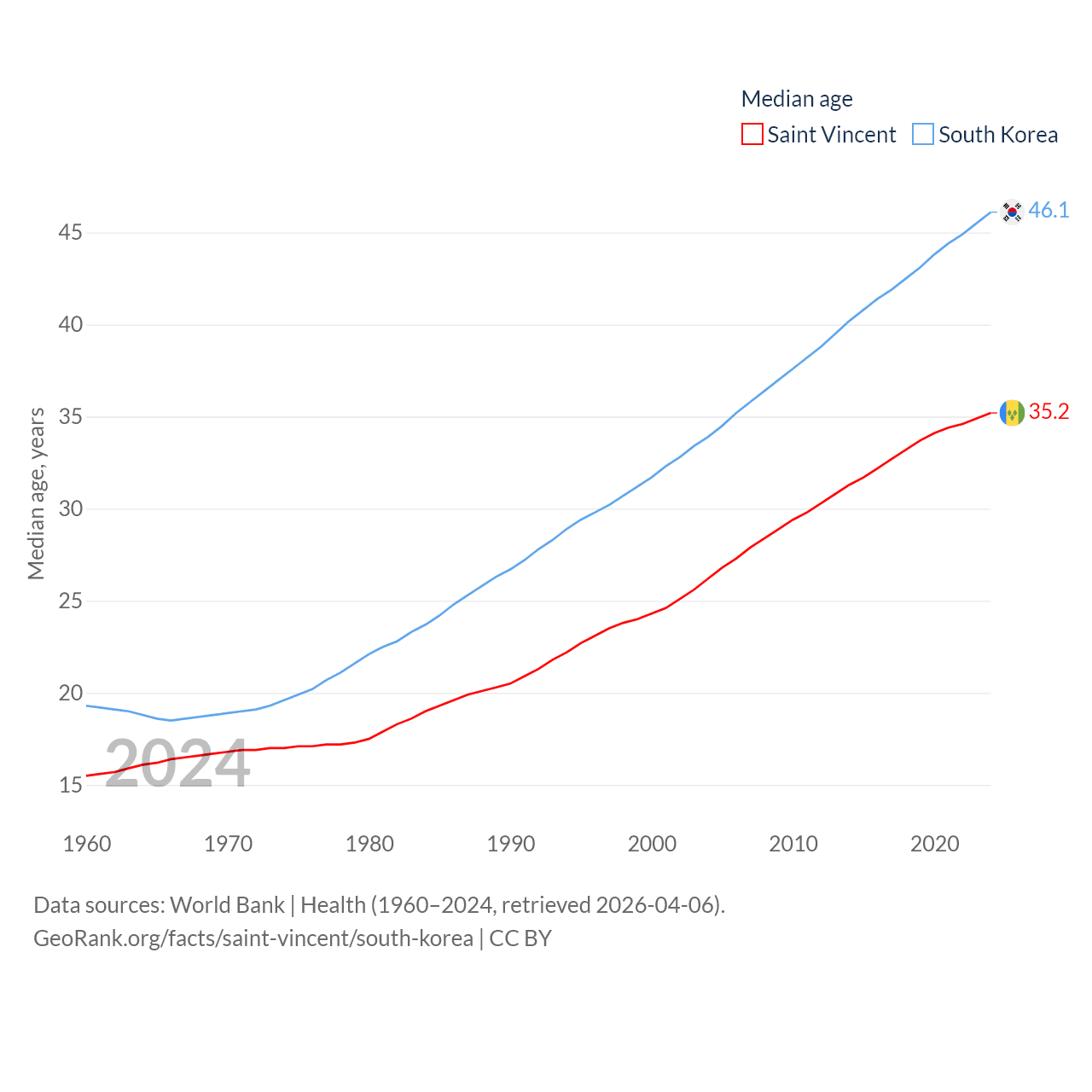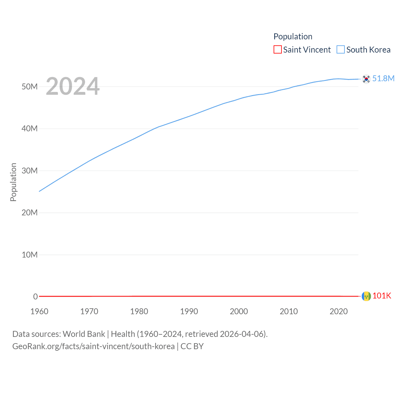 Saint Vincent has a population of 101K (ranked 184/197), compared with 51.8M in South Korea (ranked 29/197). Saint Vincent's land area is 150.6 sq mi versus 37,684 sq mi for South Korea (ranked 185th vs. 105th).