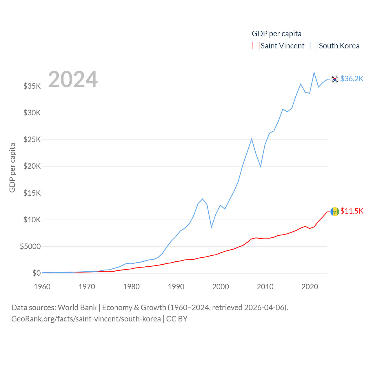 By GDP, Saint Vincent ranks 186/197 ($1.16B) and South Korea ranks 12/197 ($1.88T). By GDP per capita, Saint Vincent ranks 81/197 ($11,501), while South Korea ranks 31/197 ($36,239).