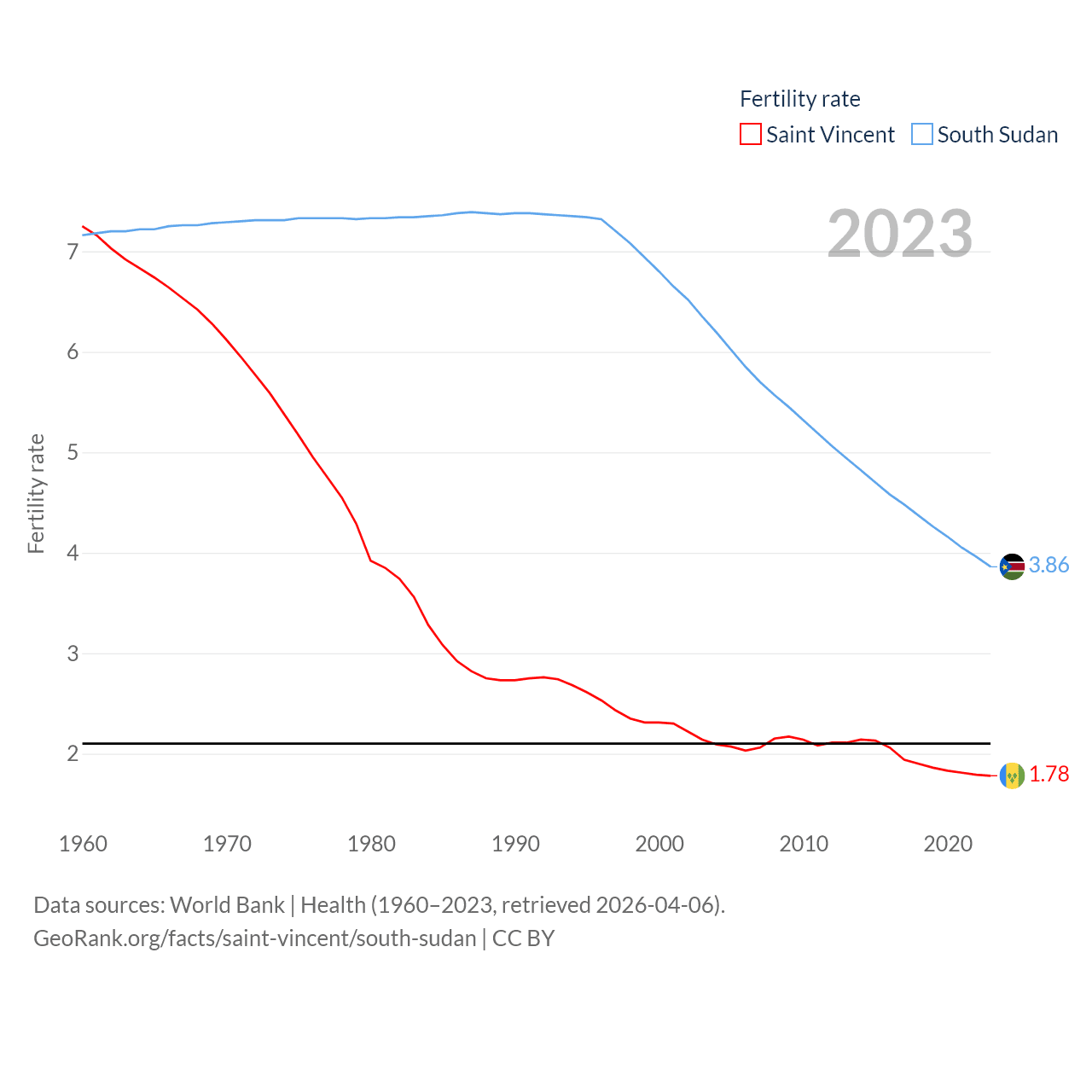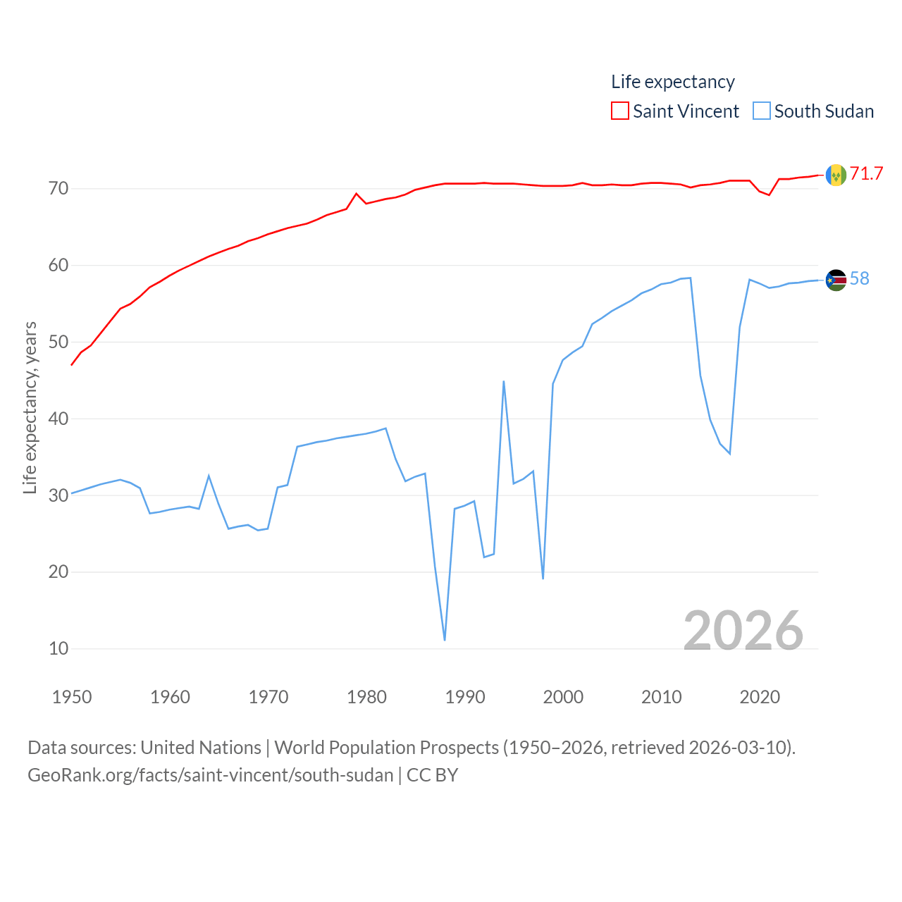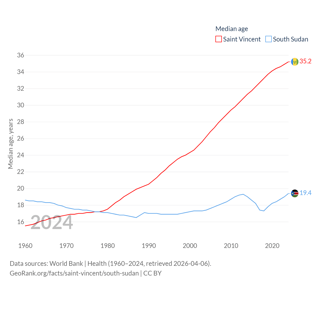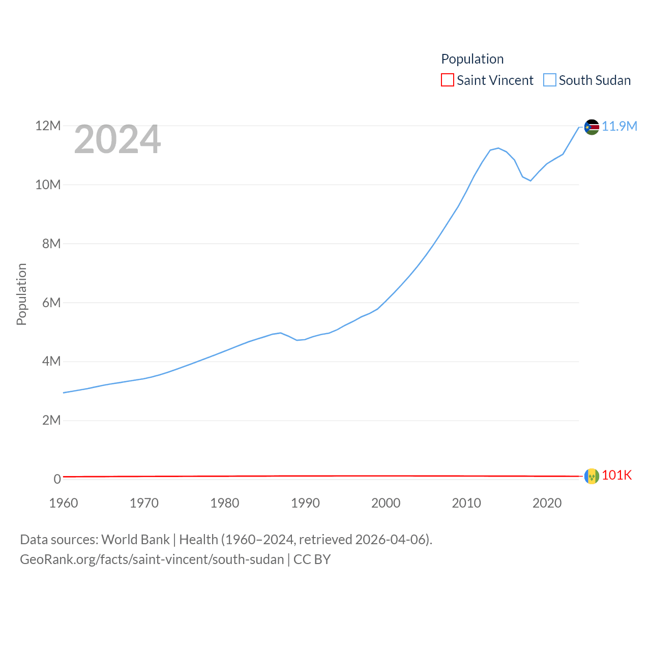 Saint Vincent has a population of 101K (ranked 184/197), compared with 11.9M in South Sudan (ranked 81/197). Saint Vincent's land area is 150.6 sq mi versus 243,990 sq mi for South Sudan (ranked 185th vs. 41st).