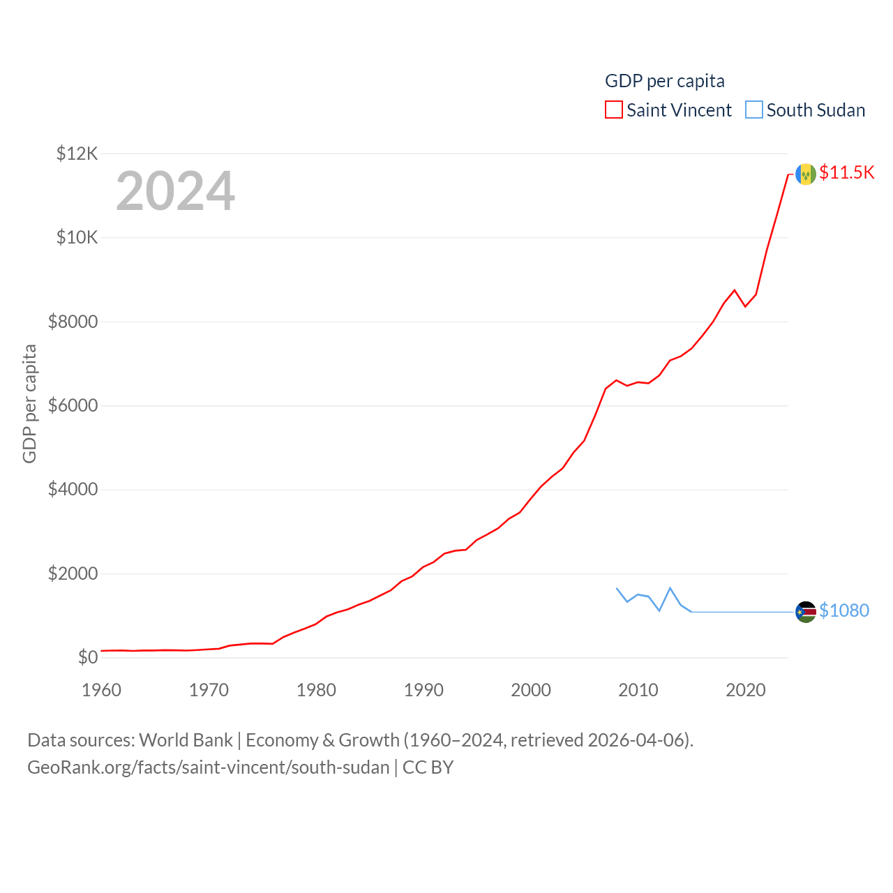 By GDP, Saint Vincent ranks 186/197 ($1.16B) and South Sudan ranks 149/197 ($12B). By GDP per capita, Saint Vincent ranks 81/197 ($11,501), while South Sudan ranks 175/197 ($1,080).