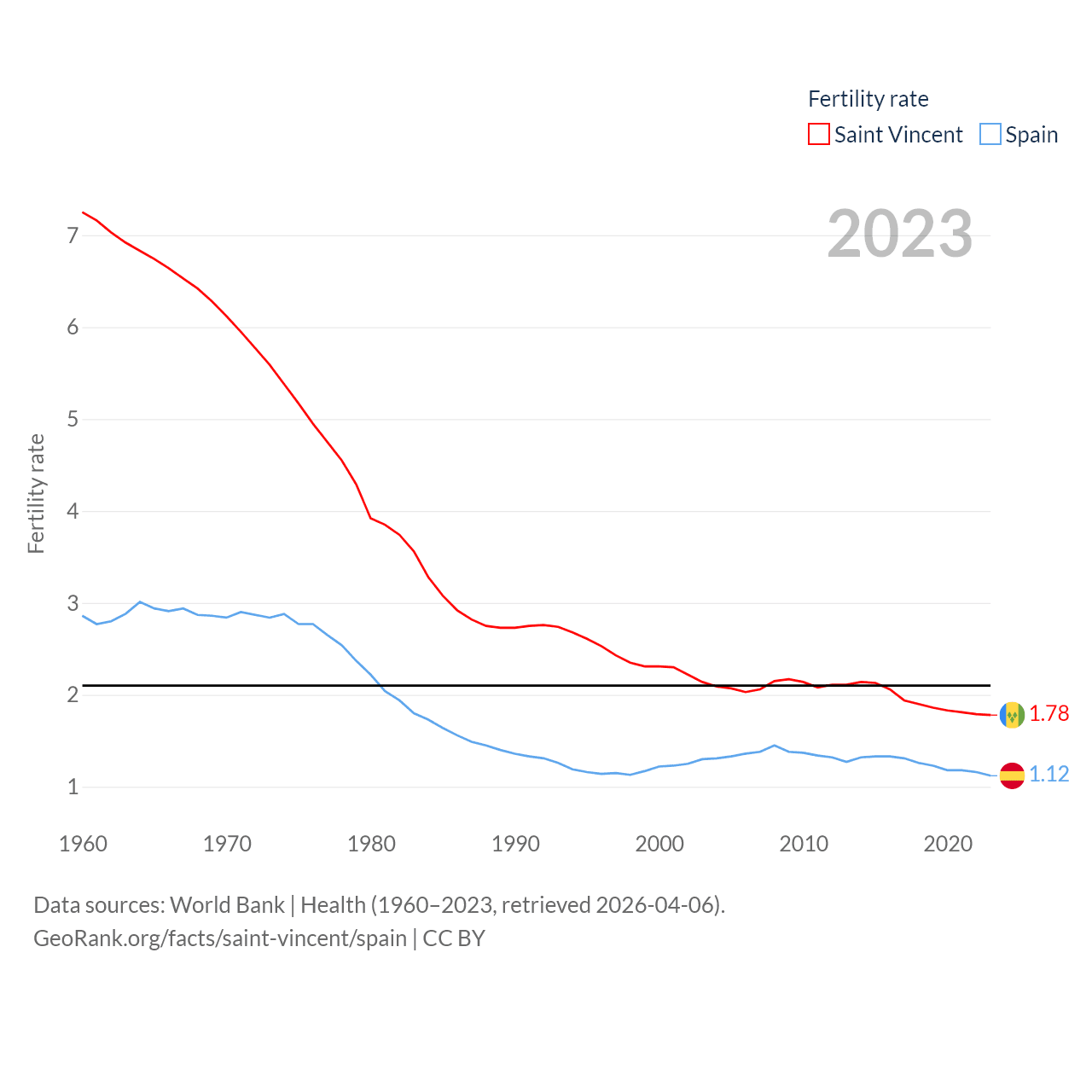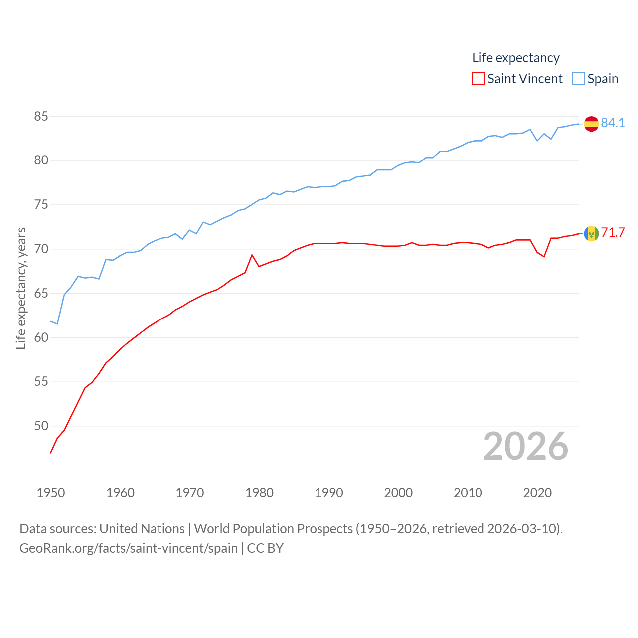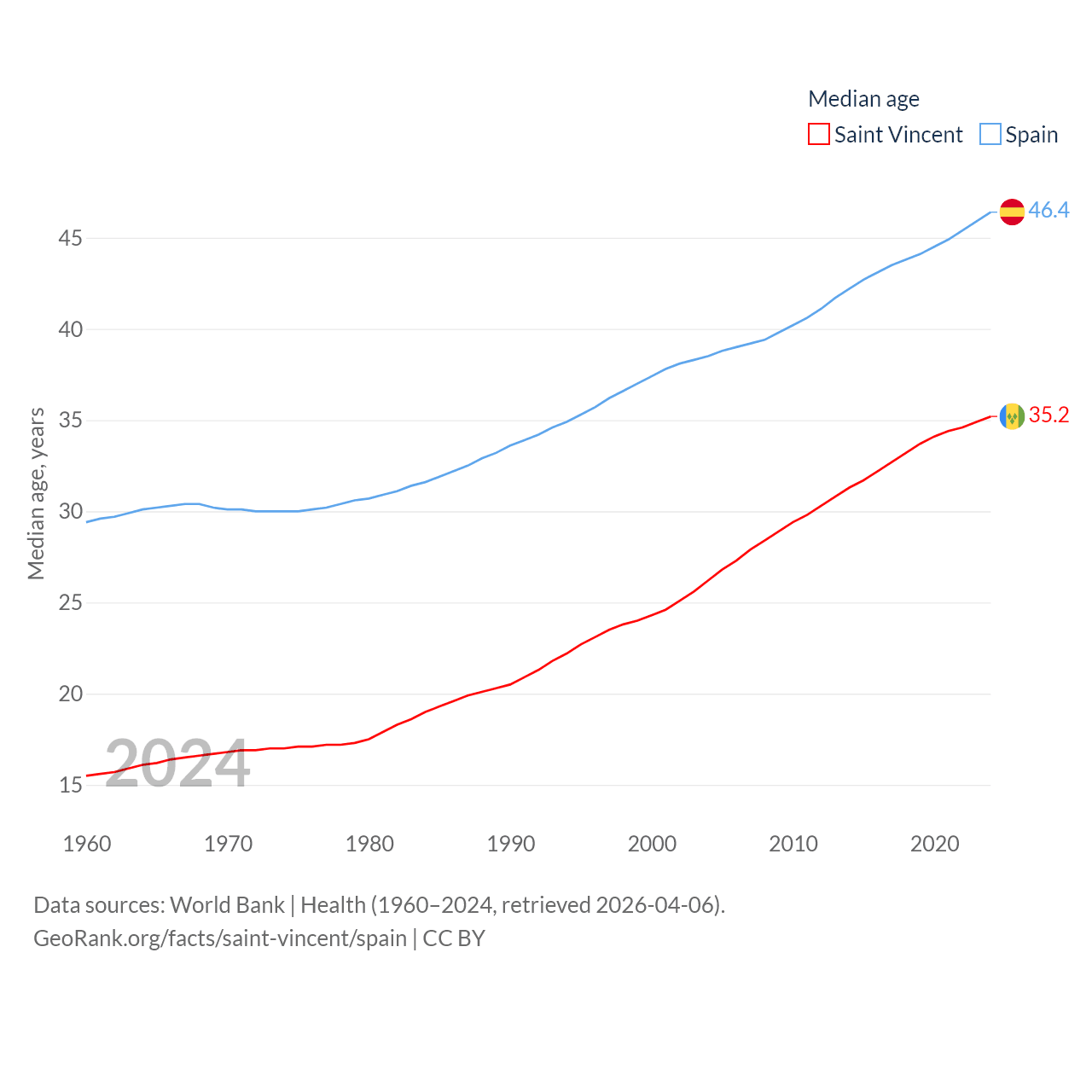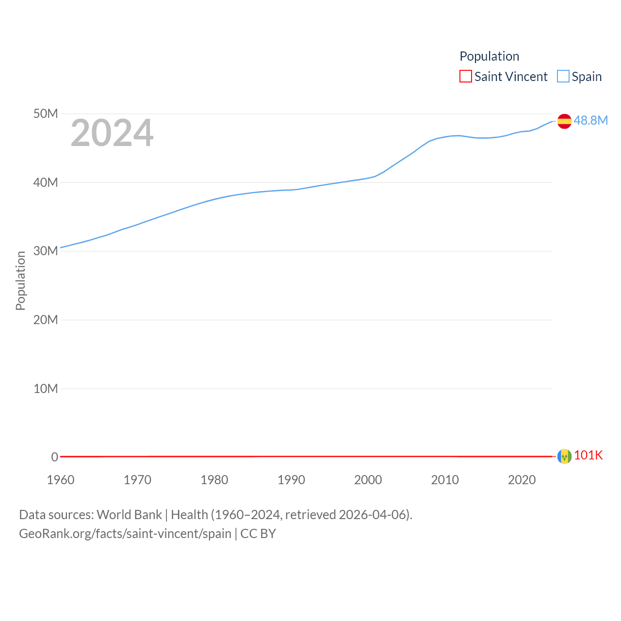 Saint Vincent has a population of 101K (ranked 184/197), compared with 48.8M in Spain (ranked 32/197). Saint Vincent's land area is 150.6 sq mi versus 192,934 sq mi for Spain (ranked 185th vs. 51st).
