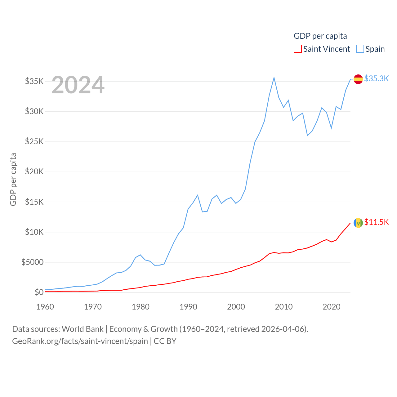 By GDP, Saint Vincent ranks 186/197 ($1.16B) and Spain ranks 15/197 ($1.73T). By GDP per capita, Saint Vincent ranks 81/197 ($11,501), while Spain ranks 32/197 ($35,327).