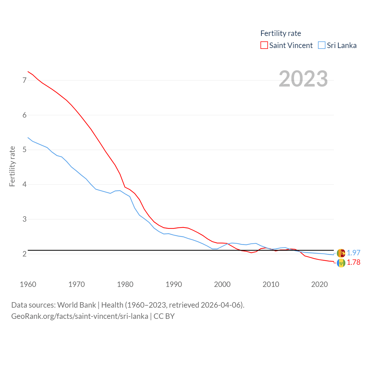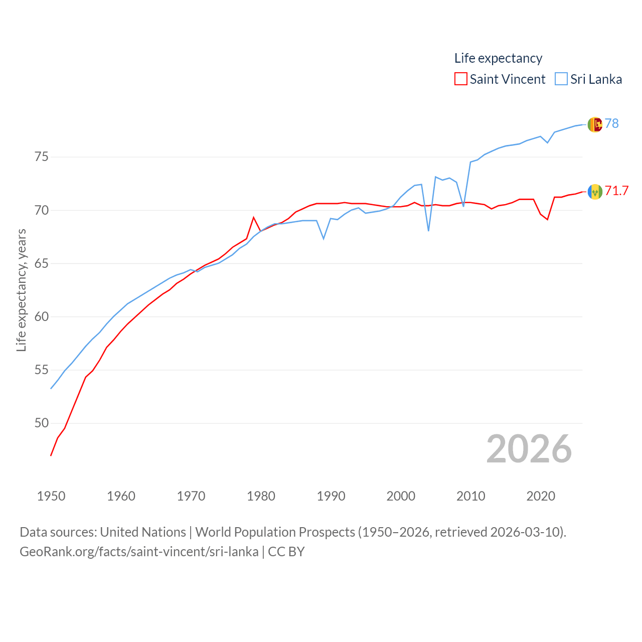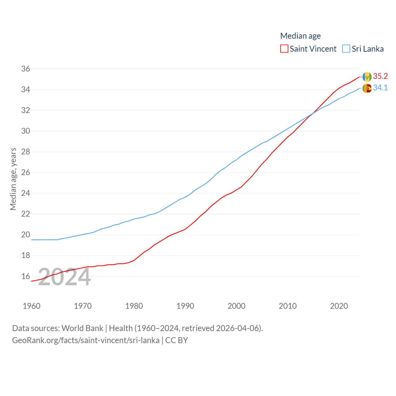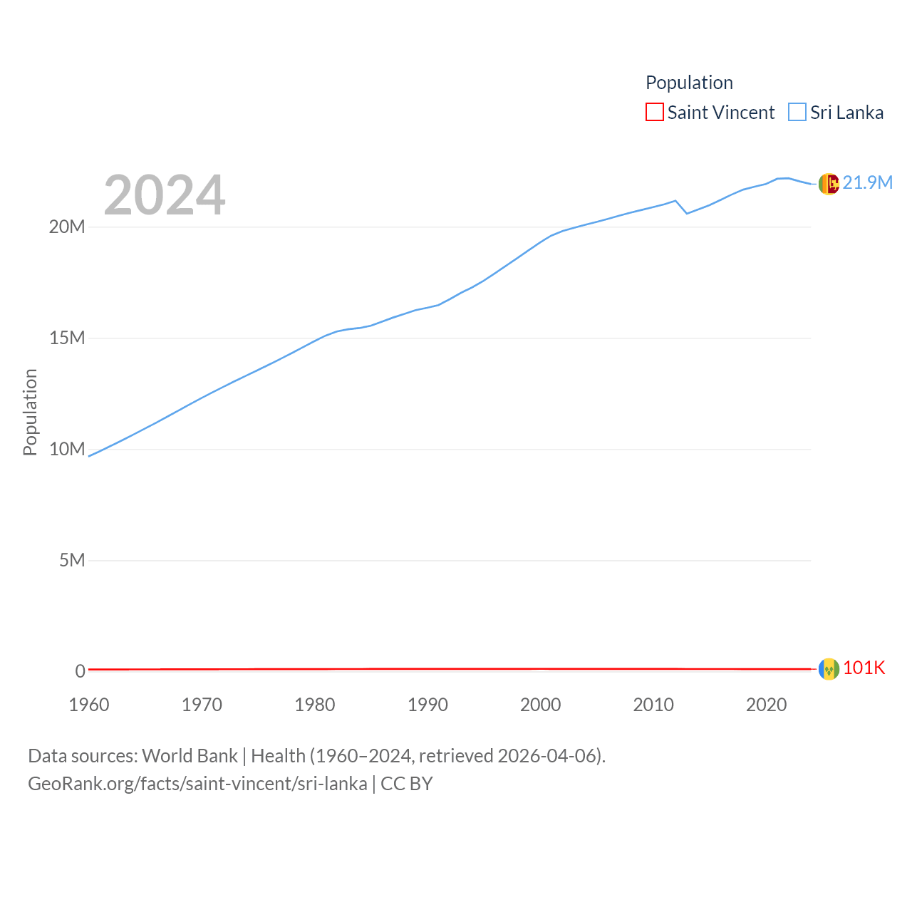Saint Vincent has a population of 101K (ranked 184/197), compared with 21.9M in Sri Lanka (ranked 61/197). Saint Vincent's land area is 150.6 sq mi versus 23,884 sq mi for Sri Lanka (ranked 185th vs. 122nd).