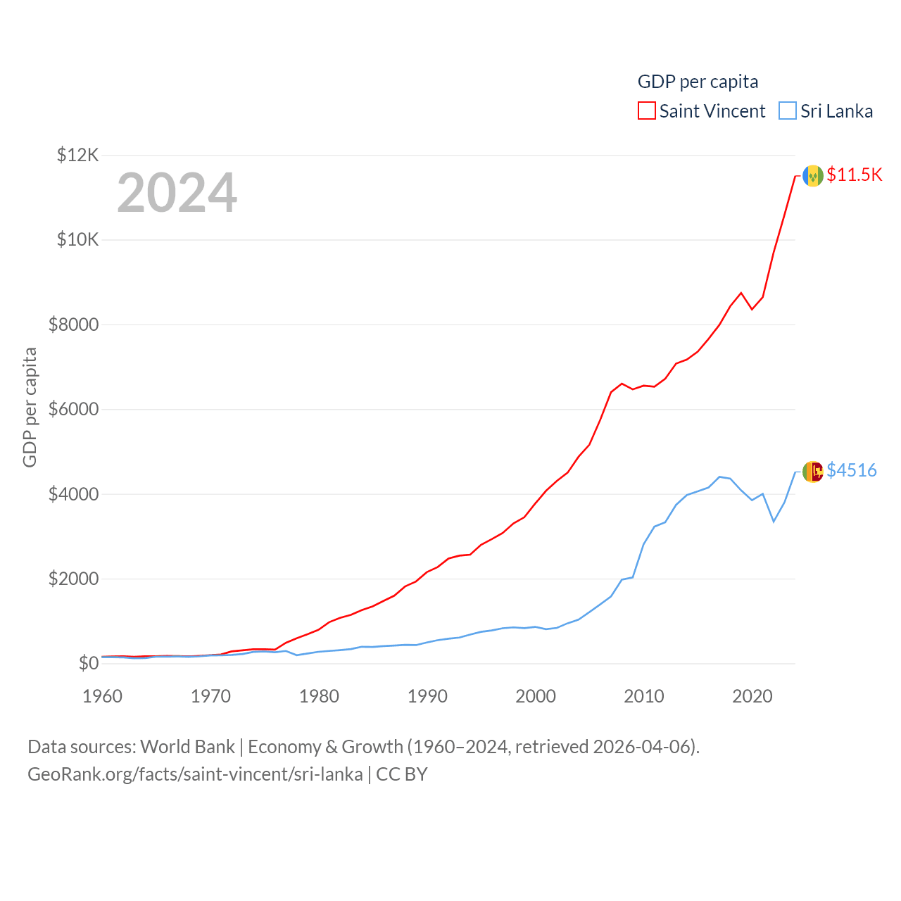 By GDP, Saint Vincent ranks 186/197 ($1.16B) and Sri Lanka ranks 72/197 ($99B). By GDP per capita, Saint Vincent ranks 81/197 ($11,501), while Sri Lanka ranks 124/197 ($4,516).