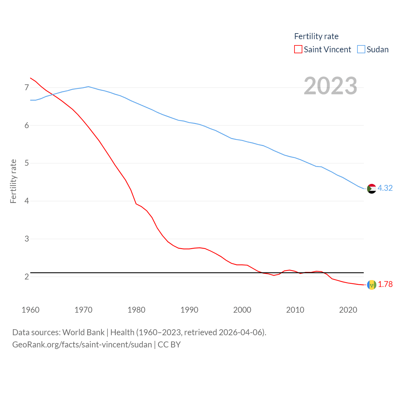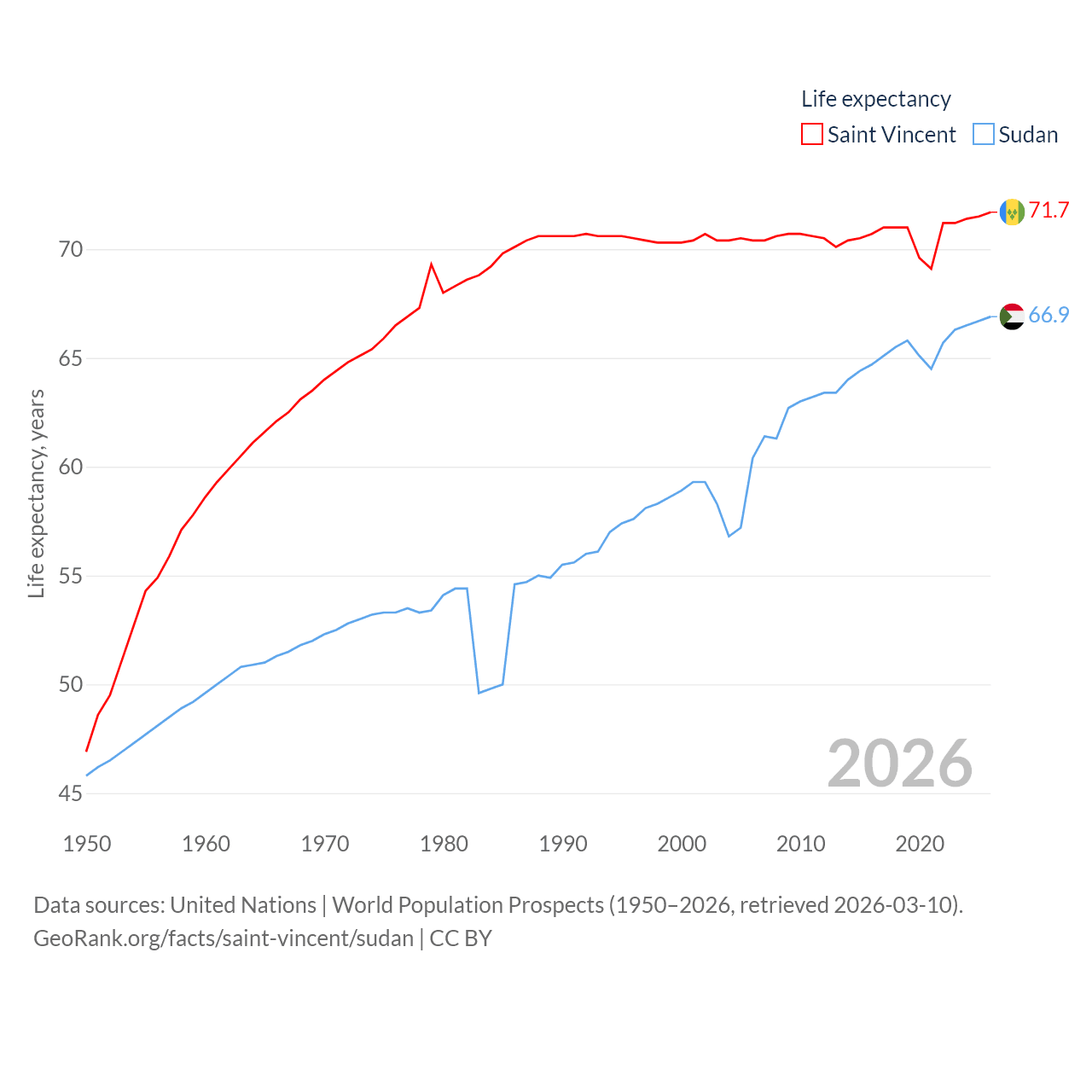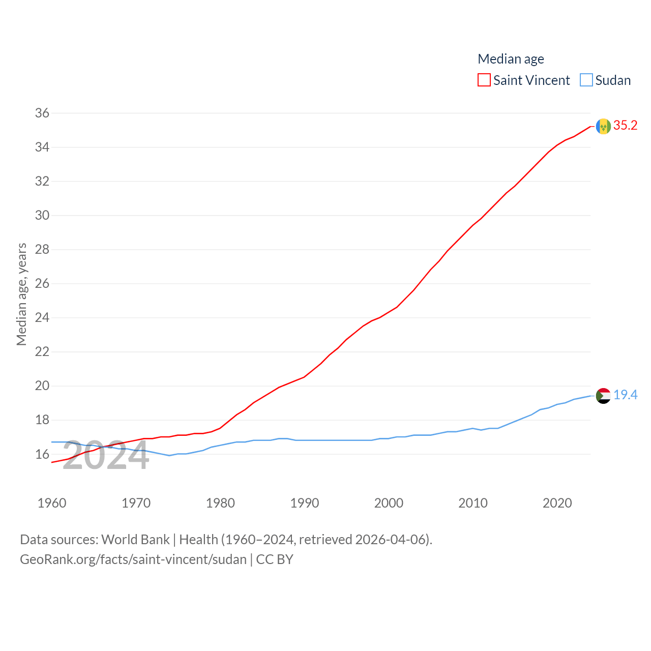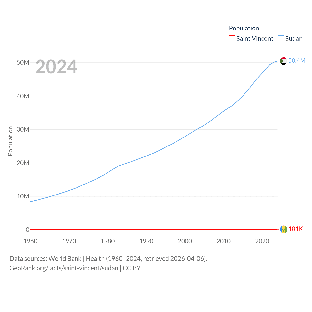 Saint Vincent has a population of 101K (ranked 184/197), compared with 50.4M in Sudan (ranked 30/197). Saint Vincent's land area is 150.6 sq mi versus 721,239 sq mi for Sudan (ranked 185th vs. 15th).