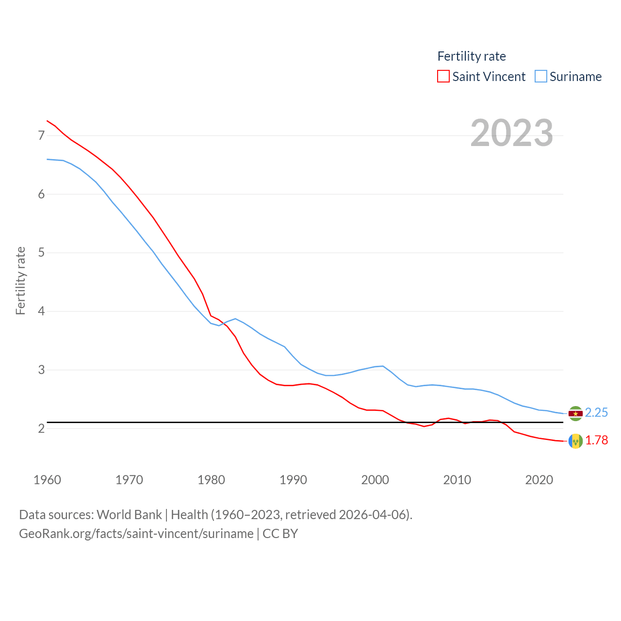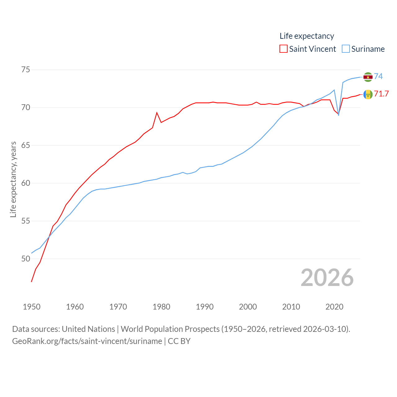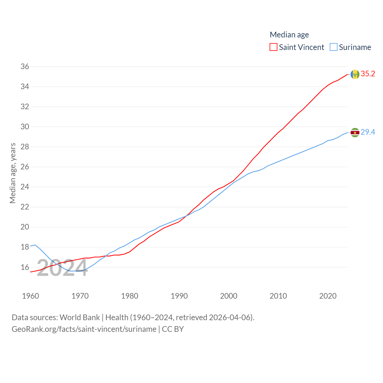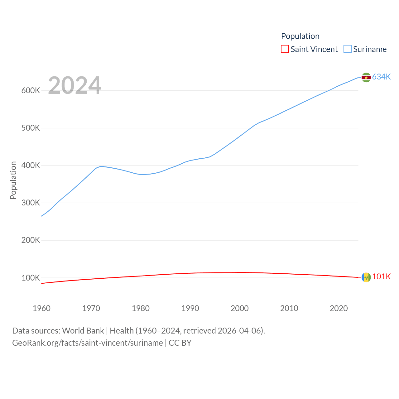 Saint Vincent has a population of 101K (ranked 184/197), compared with 634K in Suriname (ranked 165/197). Saint Vincent's land area is 150.6 sq mi versus 61,972 sq mi for Suriname (ranked 185th vs. 90th).