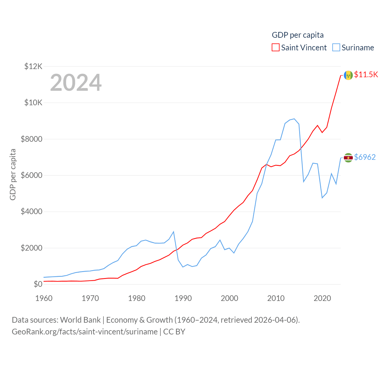By GDP, Saint Vincent ranks 186/197 ($1.16B) and Suriname ranks 164/197 ($4.42B). By GDP per capita, Saint Vincent ranks 81/197 ($11,501), while Suriname ranks 102/197 ($6,962).
