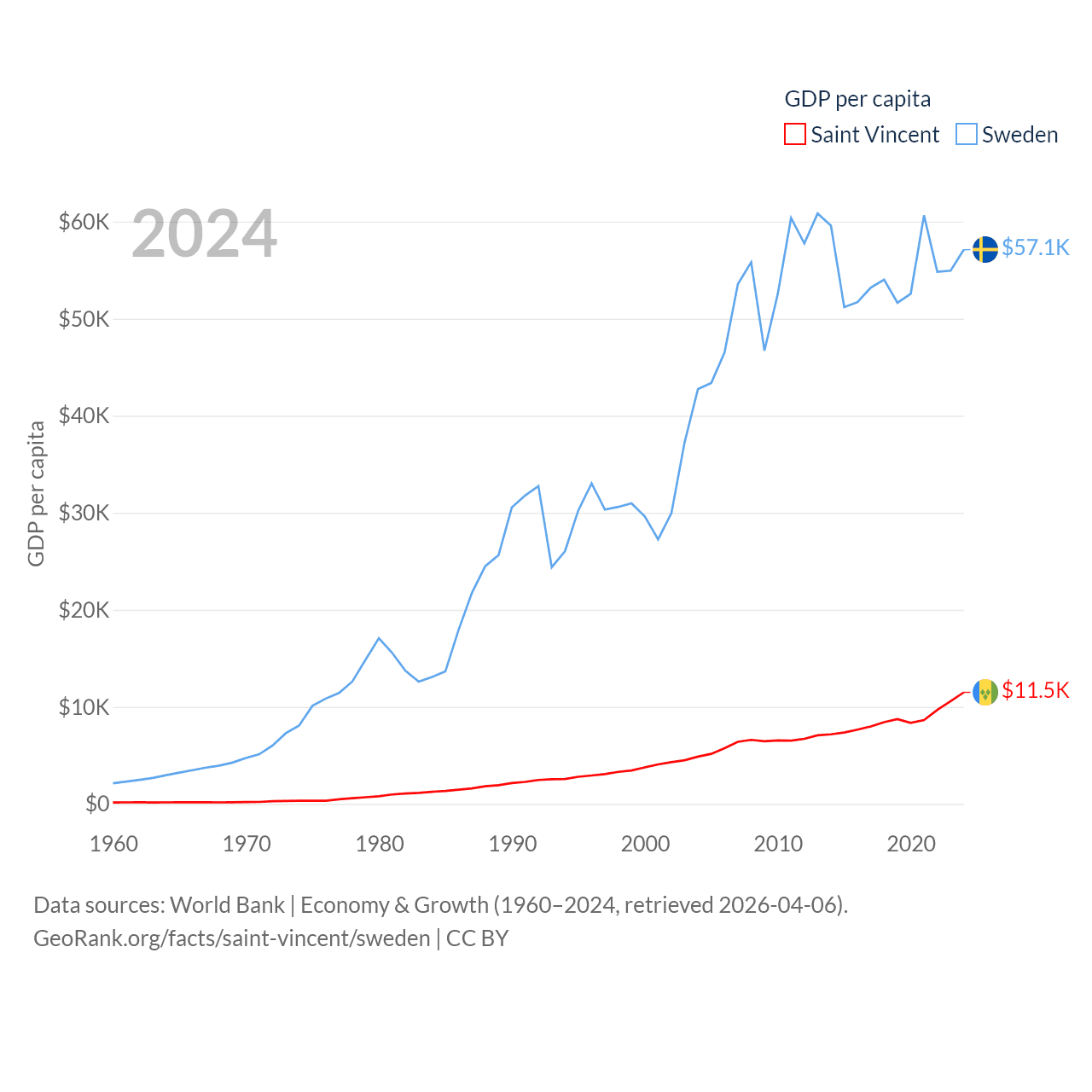 By GDP, Saint Vincent ranks 186/197 ($1.16B) and Sweden ranks 26/197 ($604B). By GDP per capita, Saint Vincent ranks 81/197 ($11,501), while Sweden ranks 17/197 ($57,117).