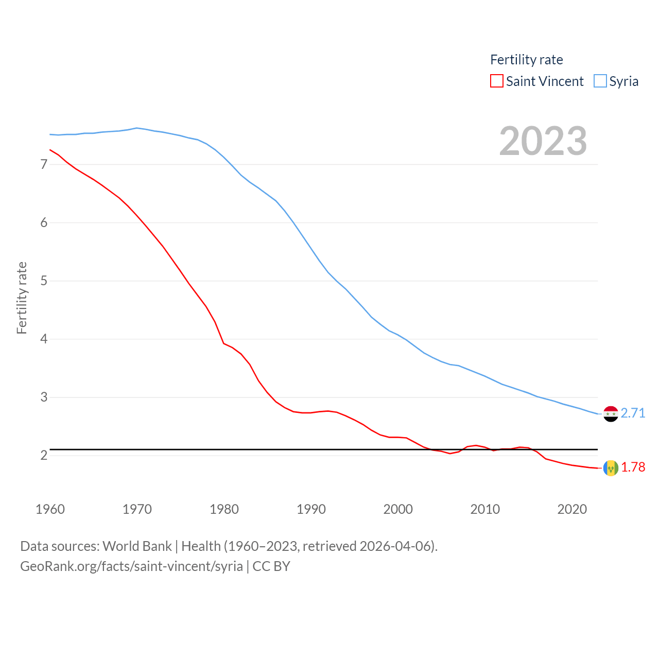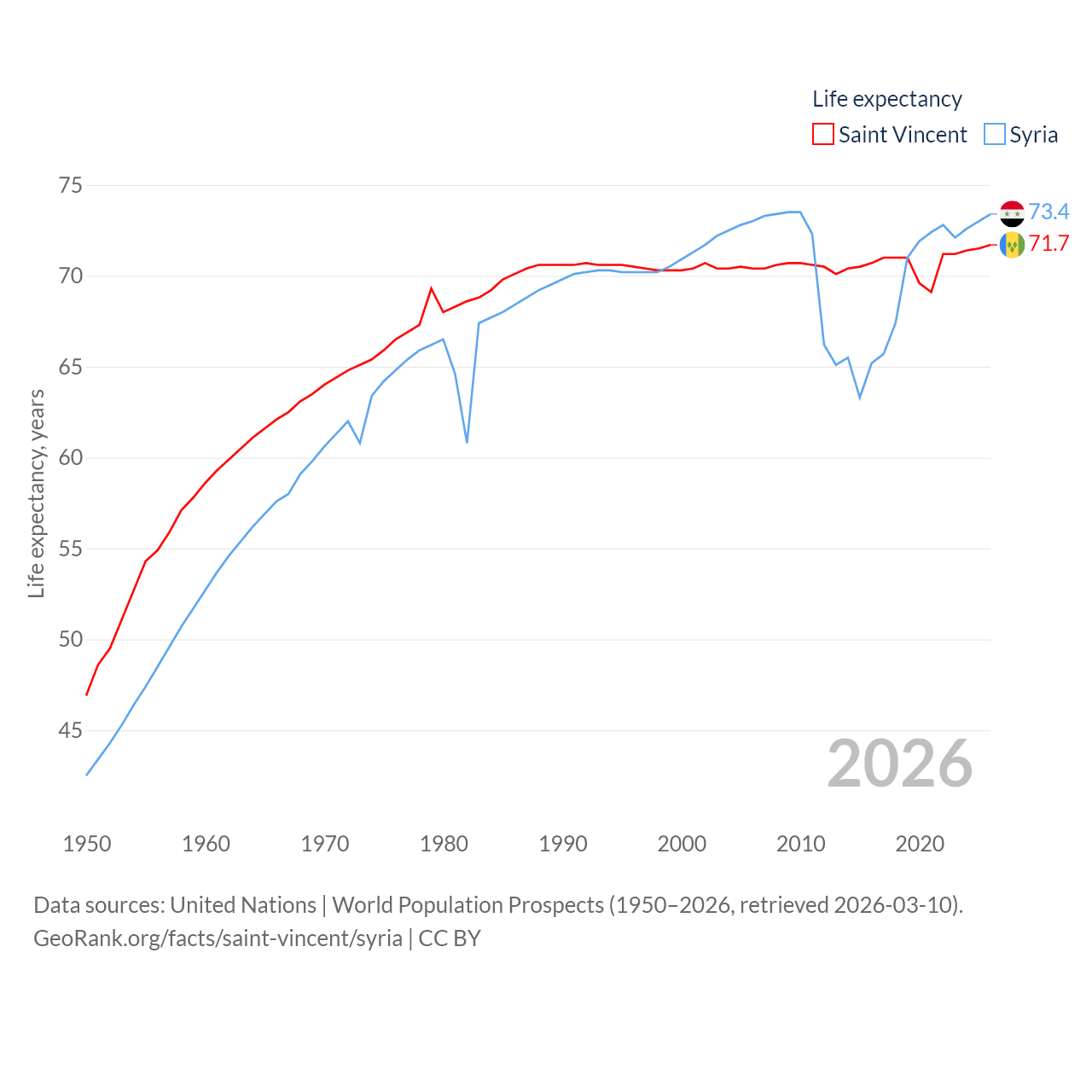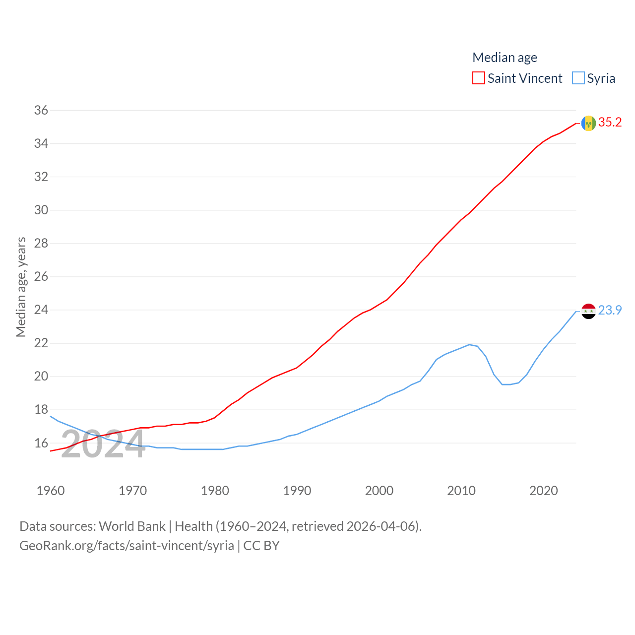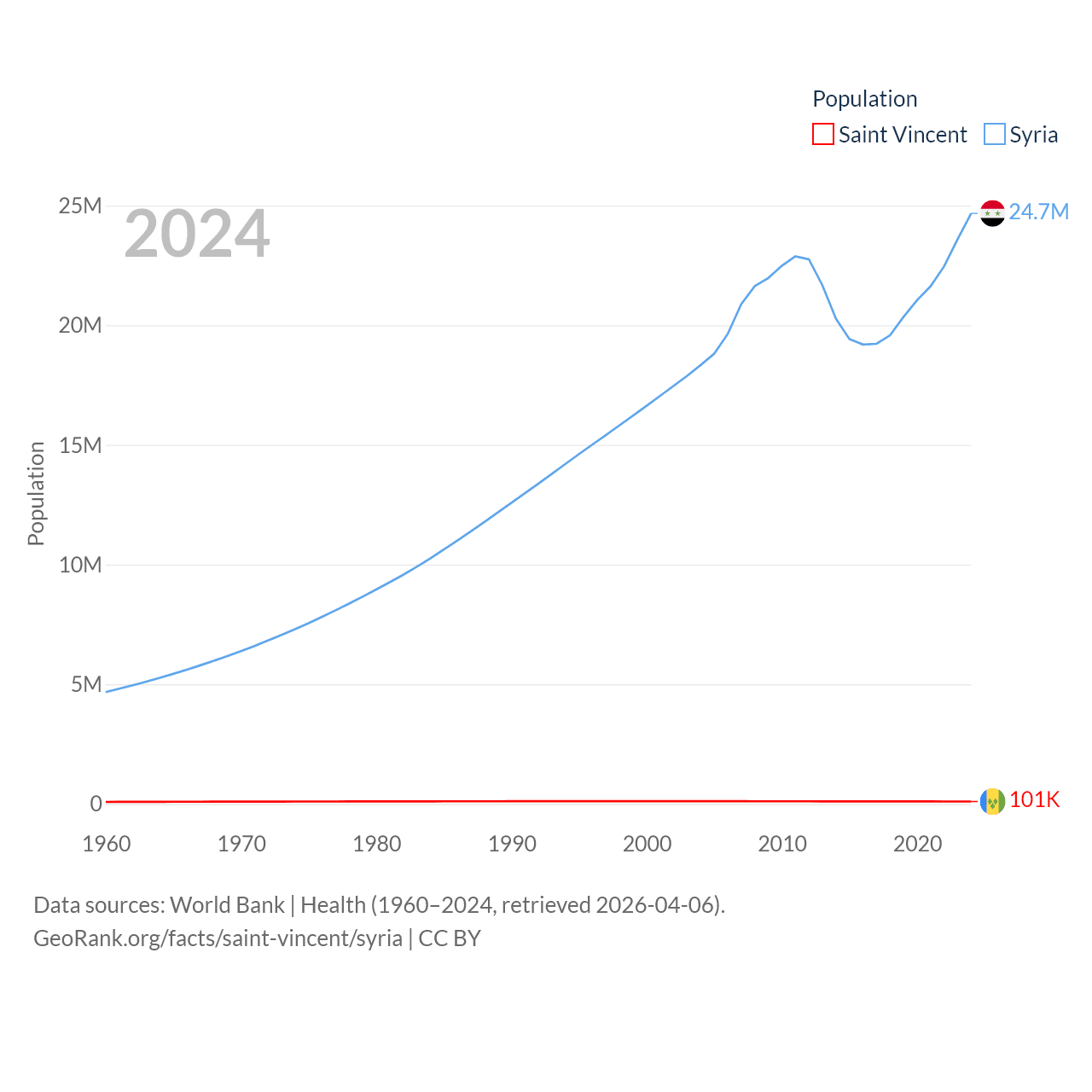Saint Vincent has a population of 101K (ranked 184/197), compared with 24.7M in Syria (ranked 57/197). Saint Vincent's land area is 150.6 sq mi versus 70,900 sq mi for Syria (ranked 185th vs. 87th).