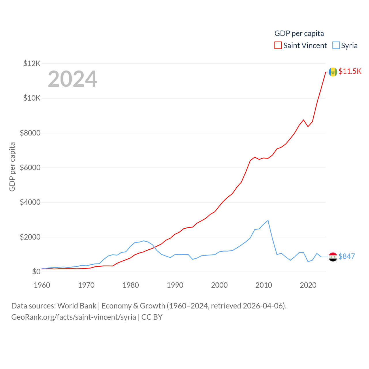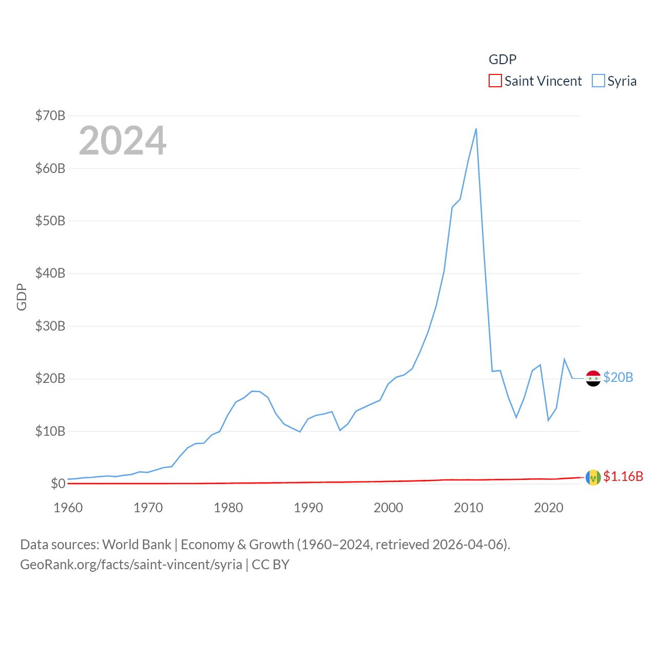 By GDP, Saint Vincent ranks 186/197 ($1.16B) and Syria ranks 129/197 ($20B). By GDP per capita, Saint Vincent ranks 81/197 ($11,501), while Syria ranks 185/197 ($847).